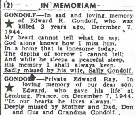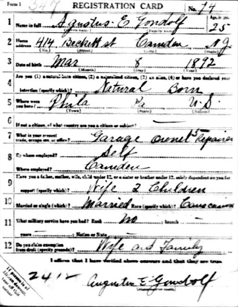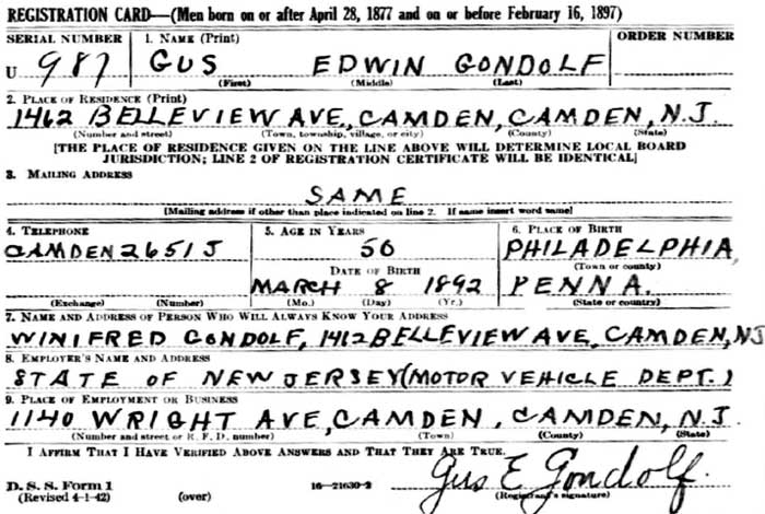 Gus Gondolf apprenticed as a stationary engineer on coal furnaces, and seeing which way the wind was blowing, became one of Camden's first auto mechanics. By 1917 he owned his own garage. At that time he and his wife Winifred resided at 414 Beckett Street in South Camden with their two sons, Edward and Donald. A third son, Augustus E. "Gus" Gondolf Jr. was born on March 29, 1918. During the 1920s the Gondolf family moved to Parkside, residing at 1462 Belleview Avenue. By 1942 he was working as the Superintendent of the New Jersey state motor vehicle inspection station at 1140 Wright Avenue. Tragedy struck the Gondolf family in December 7, 1944 when oldest son Edward Gondolf was killed in action during the fighting around Lemberg, France. Gus Gondolf Sr. died in 1951 and was buried at Harleigh Cemetery. His wife, last a resident of Somerdale NJ, joined him in 1976. |