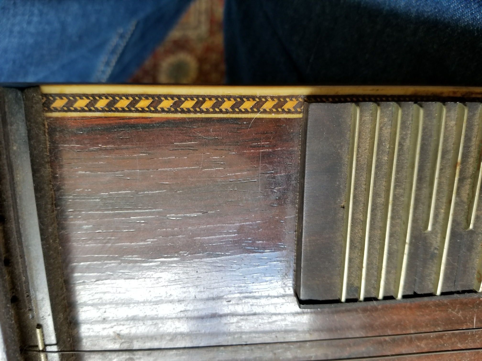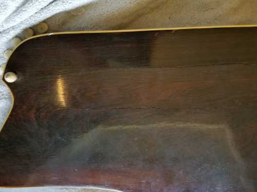 The back and sides appear to be mahogany. The sharp "V" neck is mahogany. The fingerboard is made from Brazilian rosewood.rboard. |