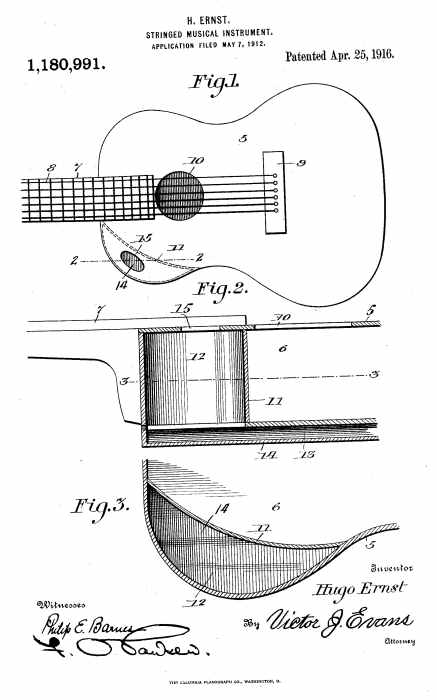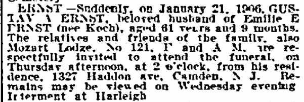 GUSTAV A. ERNST and his son G. HUGO ERNST came to Camden from Germany in the 1880s and over the next manufactured and sold musical instruments, first from a workshop which became a small factory adjoining their home at 1274 Mechanic Street, and later from 1327 Haddon Avenue. Gustav Ernst & Son made guitars, zithers, and mandolins. In 1916 Hugo Ernst was granted a patent for what in essence was an acoustic guitar with two sound chambers. Gustav Ernst passed away in January of 1906. His son carried the business forward. He sold the factory on the corner of Mechanic Street and Norris Street in 1908, and consolidated his home, workshop and business a 1327 Haddon Avenue. Hugo Ernst passed away shortly before the compilation of the 1926 Camden City Directory, His wife Martha and daughter Margaret remained on Haddon Avenue into the 1930s. They were renting at 1332 Thurman Street when the 1940 census was enumerated. City Directories from 1943 and 1947 Martha and Margaret Ernst at 1121 Kaighn Avenue, Apartment A. |