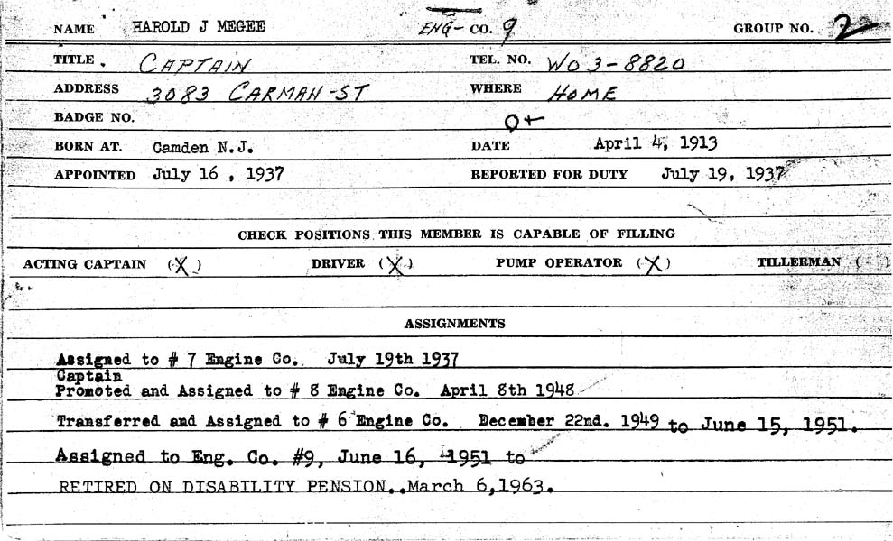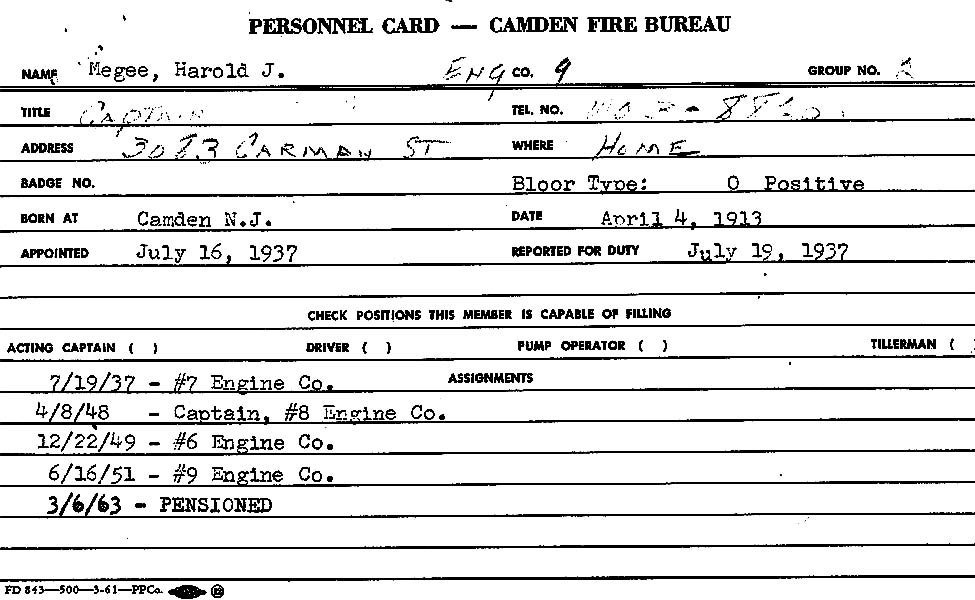 HAROLD J. MEGEE was born in Camden, New Jersey on April 4, 1913, one of at least four children born to Emma and Leonard J. Megee. In January of 1920 the family, which included older brother Leonard H. and younger sisters Beatrice and Evelyn, lived at 407 Royden Street in South Camden. Leonard J. Megee was then working as a janitor in one of Camden's public schools. He later was appointed to the Camden Fire Department, possibly through the influence of James Tatem, who served as Camden's Chief of Police for a time in the mid-1920s. When the Census was taken in April of 1930, the Megee family lived at 613 South 5th Street, the corner of south 5th and Royden Streets. James Tatem was their next door neighbor at 615 South 5th Street, and Albert Fogg, a clerk at Camden's City Hall, resided at 617. Just around the corner at at 458 Royden Street was Camden policeman Nathan Petit, at 456 was Camden fire fighter john lutts. Harold Megee followed his father into the Camden Fire Department. He was appointed to the department on July 16, 1937 and was assigned to Engine Company 7 on Kaighn Avenue above Mount Ephraim Avenue, where he reported for duty on July 19, 1937. The 1940 Camden City Directory shows Harold Megee living at 515 Benson Street. By the time the 1943 edition was compiled, he had moved to 3083 Carman Street, where he lived into the 1970s. Harold Megee was promoted to Captain and transferred to Engine Company 8, 619 Kaighn Avenue, on April 6, 1948. He was reassigned on December 22, 1949 to Engine Company 6, Front and Linden Streets, where he served until June 15, 1951, when he was again transferred, this time to Engine Company 9 at North 27th Street and Federal Street in East Camden, not far from his home at 3083 Carman Street. Captain Megee served at Engine 9 until he retired on a disability pension on March 6, 1963. Harold Megee moved out of Camden by the fall of 1977. Last a resident of Medford, New Jersey Harold J. Megee passed away in May of 1978. |
