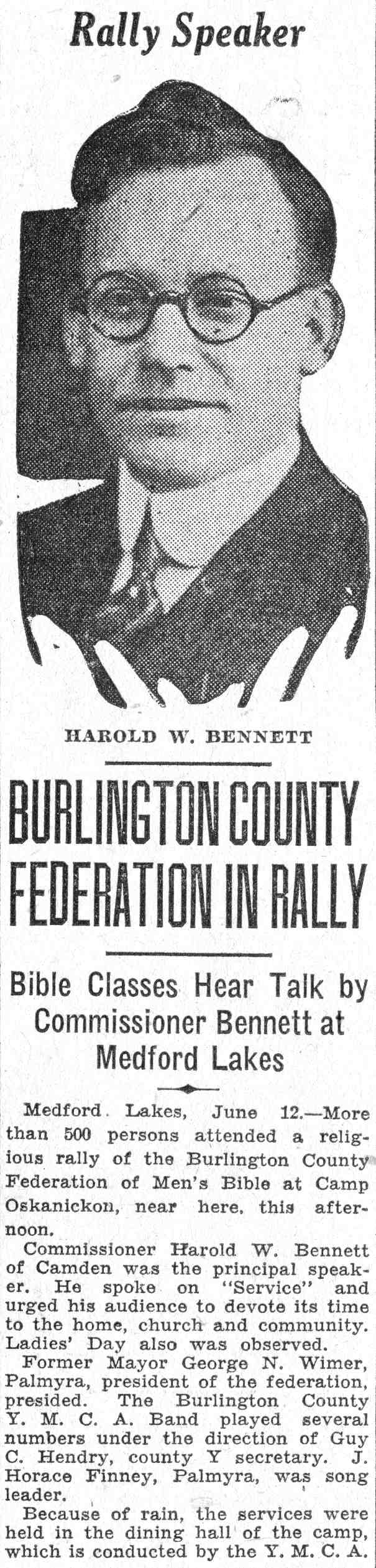 HAROLD W. BENNETT was born in New Jersey on May 19, 1895. After serving in the military during World War I, He trained as a lawyer. At the time of the January 1920 Census, Harold W. Bennett was lodging at the YMCA building at 566 Federal Street, and working as a law clerk. He married Agnes Raff later that year. In 1926 he served as International President of the Y's Men, a service club connected to the YMCA. Harold Bennett was also in the early 1920s active in the fund raising drive that culminated in the building of the Walt Whitman Hotel at Broadway and Cooper Street. When the 1930 census was taken, the Bennett family, which included son Judson and daughter Rosemary, lived at 2625 baird boulevard in East Camden. Also living at the Baird Boulevard address was mother-in-law Emily Raff. His neighbors included lawyer Samuel P. Orlando at 2613 baird, and lawyer Lewis Liberman at 2603. Harold Bennett was then in private practice, but before 1930 ended he would be working as general counsel for the City of Camden. Harold W. Bennett was elected to a seat on Camden's city commission in May of 1931, and re-elected in may of 1935. The 1935 election, however was later invalidated by way of a recount. Harold Bennett initially supervised financial matters for the city, but was replaced by George Brunner in early 1936. After 16 months of legal conflict, he was replaced on the city commission by Frank J. Hartmann Jr., in October of 1936. He would return to his own law practice, making his office at 317 Market Street. He also taught classes in constitutional law at the South Jersey Law School during the 1930s. The 1947 Camden City Directory shows that Harold and Agnes Bennett had moved to Haddon Heights. He was then with the law firm of Bennett, Bennett, & Wingate. Harold Bennett spent the rest of his days as a resident of Haddon Heights, passing away in April of 1981. |