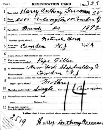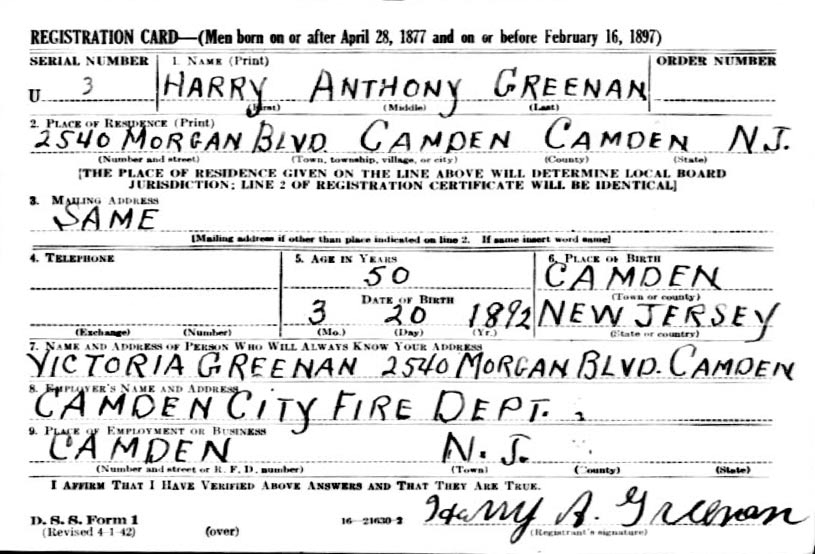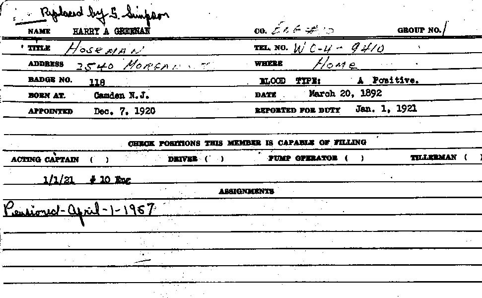 Harry Greenan was one of at least eleven children. When the 1900 Census was taken, only eight of the Greenan children were alive, William H. Jr., John J., Peter, Hugh T., Annie, Harry, Joseph, and Mary. William Greenan Sr. worked as a teamster, as did William Jr., while John J. and Peter were by then working as rug weavers. The family lived at 1729 Master Street in Camden's Eight Ward. The 1914 City Directory shows Harry Greenan working as a pipefitter and living at 2003 Arlington Street with other members of the Greenan family.On June 5, 1917 Harry A. Greenan registered for the draft. He was then boarding at 2005 Arlington Street, and working as a pipe fitter at the nearby New York Shipbuilding Corporation shipyards. He was still single at the time. The 1920 Census shows Harry Greenan living with his father and brothers Peter and Joseph at 687 Fairview Street. On December 7, 1920 Harry A. Greenan was appointed to the Camden Fire Department. He reported for duty in January 1, 1921. By 1924 Harry A. Greenan had married. He and wife Victoria then lived at 737 Sylvan Street, just north of Morgan Street. They remained at that address through at least 1931. When the 1940 Camden City Directory was being compiled Harry and Victoria Greenan were living at 2540 Morgan Boulevard. The Greenans were still at that address as late as the spring of 1957, when, having reached the mandatory retirement age of 65, Harry A. Greenan left the Fire Department. The Greenans were still at 2540 Morgan Boulevard into the 1970s. By 1977 the family was gone from Morgan Boulevard. |