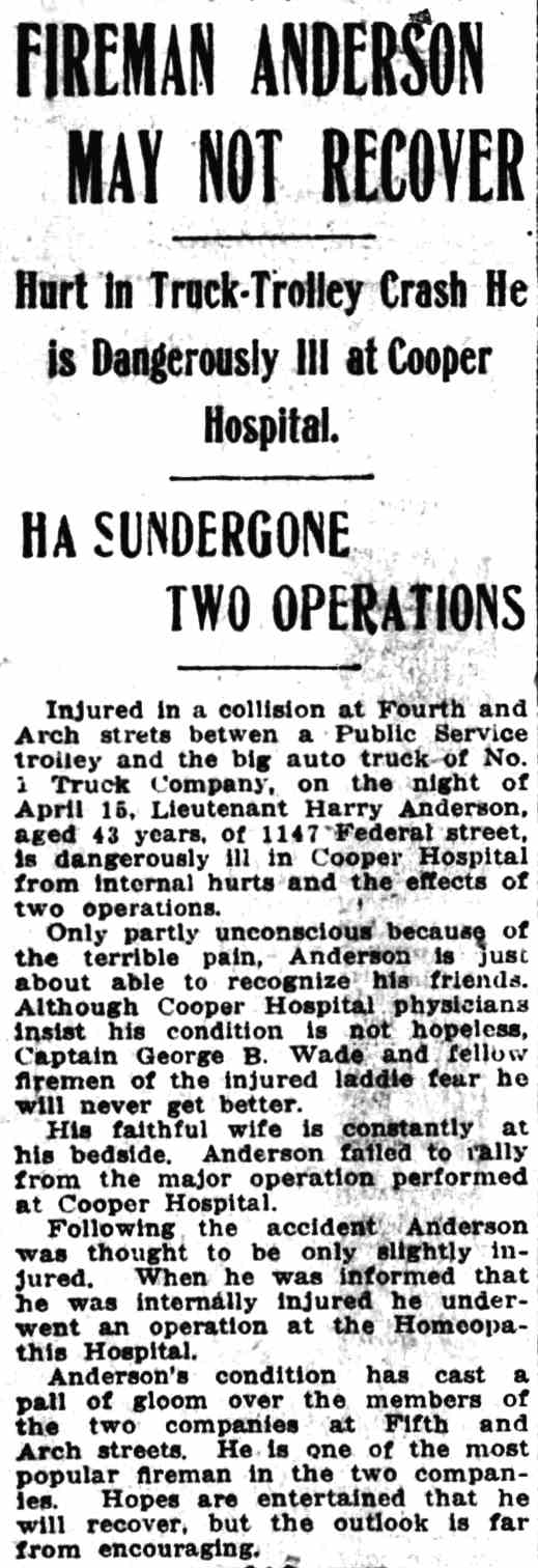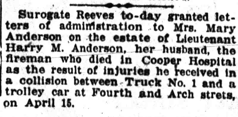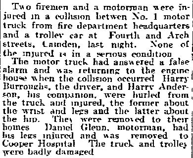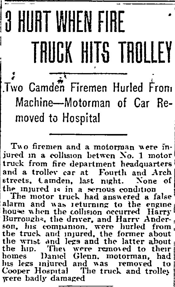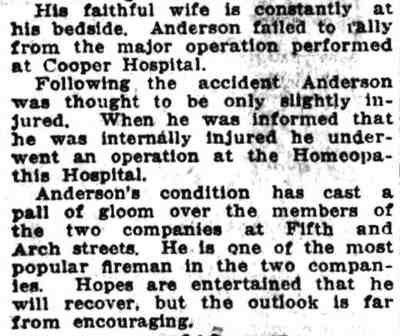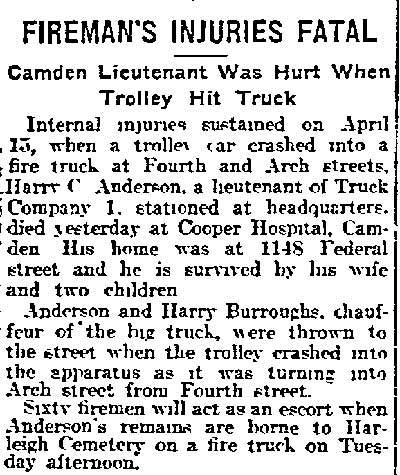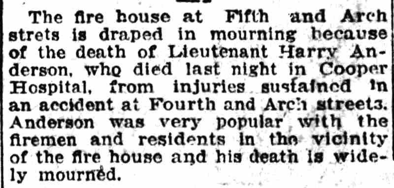 Harry C. Anderson - Harry Burrough - Daniel Glenn - ladder company 1 - North 4th Street - Arch Street |