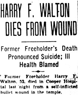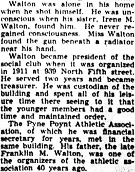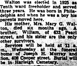 HARRY F. WALTON was born in Philadelphia on May 29, 1888. His parents Franklin M. Walton and Mary G. Walton, brought him and his brother William to Camden when they were quite young. The family was living at 520 Bailey Street in North Camden by 1892. A sister, Irene, was born in 1894. Harry F. Walton would live there for the rest of his life. Franklin Walton had been one of the organizers of the Pyne Poynt Athletic Association, and following in his father's footsteps, Harry F. Walton helped organize and was the first president of the Pyne Poynt Social Club, which had its headquarters at 939 North 5th Street. He later became custodian of the building and was serving as the groups treasurer when he died. He also served as financial secretary of the Pyne Poynt Athletic Association, which shared the building. Harry F. Walton served as a Camden County Freeholder from Camden's Tenth Ward from 1925 to 1928. Harry