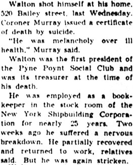 worked as a bookkeeper. Despondent over the recent death of his mother and his own poor health, Harry F. Walton shot himself at his Bailey Street home on December 27, 1939. |