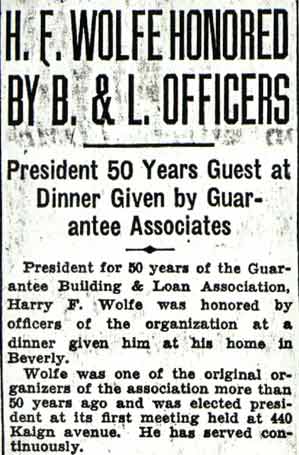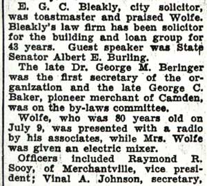 HARRY F. WOLFE was born July 9, 1856 to John and Eliza Wolfe. The family lived at 302 Cherry Street in Camden at the time of the 1880 census. Harry Wolfe was then 24, and working as a salesman. His father and younger brother John were working as wool graders. By 1887 Harry Wolfe had opened a grocery at South 3rd and Cherry Street. His business thrived, and in 1886 he helped organize the Guarantee Building & Loan Association. At the Association's first meeting, at 440 Kaighn Avenue, Harry F. Wolfe was elected president. He served continuously in that capacity for 50 years. The first secretary was prominent Camden pharmacist Dr. George M. Beringer, and George C. Baker was one of the original members of the by-laws committee. In 1936, the directors included Dr. Conrad G. Hoell, George Beringer Jr., and Clarence Scull, of the Scull coffee family. Harry Wolfe married late in life, at the age of 43. He and wife Sadie had at least one son Joseph, who was born around 1907. By 1930 he had moved from Camden to 40 Franklin Avenue in Edgewater Park NJ. Harry Wolfe also served the community as Camden's Receiver of Taxes at the turn of the century. Harry Wolfe was still living in Edgewater Park in August of 1936, when a dinner was given in his honor, recognizing his service. |