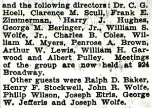 F. Wolfe Isaac Toone - John H. Fort - Philip Schmitz - O. Glen Stackhouse - Charles M. Baldwin George R. Thompson - Frederick Kauffman - Benjamin Braker - David M. Chambers William H. Davis - Dr. John W. Donges - Harry B. Paul |