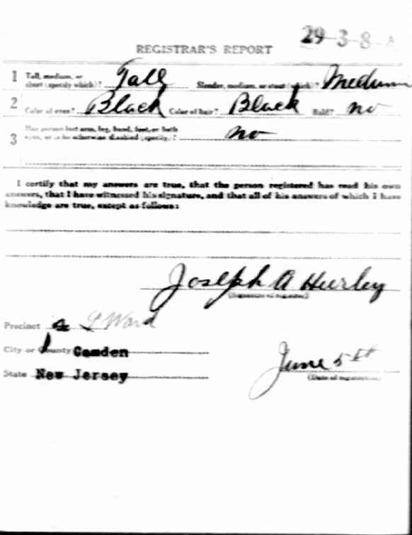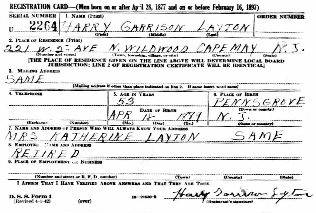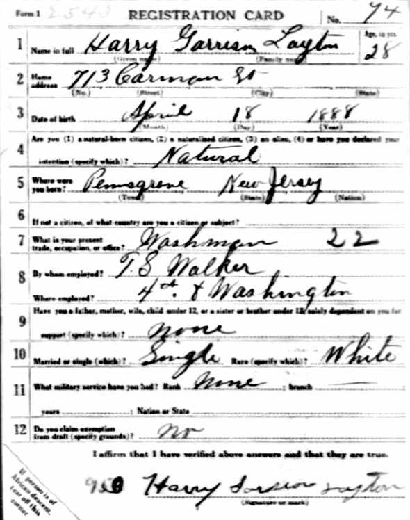 HARRY GARRISON LAYTON was born in Pennsgrove, New Jersey on April 18, 1889 to Harry and Anna Layton. His father was a carpenter and by 1900 had brought the family to Camden. When the census was taken in 1900, Harry G. Layton was living with his parents and siblings at 578 Auburn Street in South Camden. Harry Layton was the second oldest of the seven Layton children at home at the time of the Census, the others being older sister Ray and younger siblings Florence, William, Robert, Swain, and Homer. Another son, Warren, was born around 1904. |