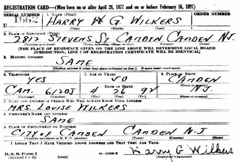 HARRY G. WILKERS SR. was born on April 26, 1892 to Daniel G. and Eliza E. Wilkers. His grandfather, also named Daniel Wilkers, was a United States Navy veteran of the Civil War. His father and widowed mother had moved to Camden from Gloucester City by 1885. City Directories from 1897 through 1899 show Daniel Wilkers and family at 314 Spruce Street. The 1900 Census shows the Wilkers family, which included older sister Mary E. Wilkers, at 332 Cherry Street. Uncle David Wilkers, a widower, lived nearby at 3 Yeager's Court with his children.