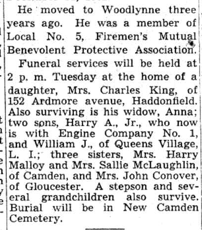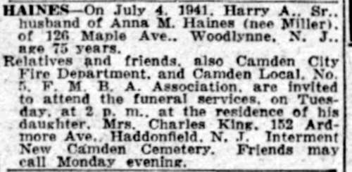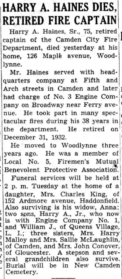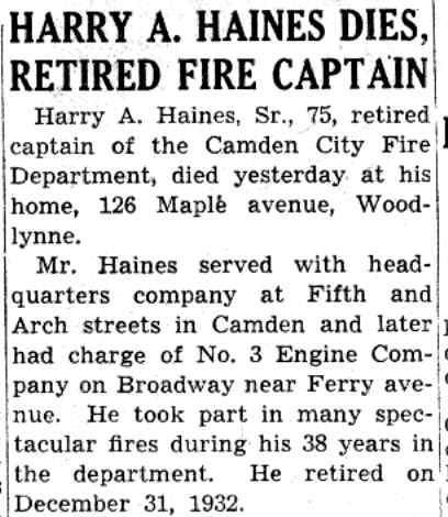 Harry Haines moved around his South Camden neighborhood quite a bit in the late 1880s. He married Mary J. Hickman in 1886, a son William was born in January of 1887. The 1887 Directory shows the Harry Haines family at 349 Liberty Street, and the 1888 Directory at 249 Sycamore Street. Daughter Ethel was born in December of 1889. By the end of 1890 the Harry Haines family had moved to 276 sycamore street. A son, Harry Albert Haines Jr., was born on May 8, 1892. The family lived at 276 Sycamore Street until the compilation of the 1898 City Directory, when they moved to 294 Sycamore Street, near the corner of South 3rd Street and Sycamore in South Camden.. Also living at the Sycamore Street address was Mrs. Haines' brother, William Hickman. Camden policeman Charles H. Fitzsimmons lived a few doors away at 1135 South 3rd Street in 1900, City Assessor Lewis Stehr Sr. was at 1131 in 1910. Lewis Stehr Jr. served as Camden's Chief of Police from 1928 until his death in 1930. Harry Haines Sr., worked as a glassblower, as his father did before him, from the time of the 1880 Census through 1896, according to the City Directories. He and his father were both working in Philadelphia in that trade as late as 1896. About this time Harry Haines Sr. secured an appointment to the Camden Fire department. He served with the Camden Fire Department as a ladderman with Ladder Company 1 in 1897, 1898 and 1899. The 1900 Census indicates that he returned to glassblowing, but by 1904 he was once again a member of the Camden Fire Department, where he served until the 1930s. In June of 1912, Hook & Ladder 2 and the Chemical Engine [Engine Company 8 - pmc] were responding first due to an alarm at Third and Liberty Streets, South Camden. Both companies turned west on Kaighn Avenue, their horses at a full gallop. At the comer of Broadway, a traffic cop attempted to stop a motorized truck to clear the street for responding apparatus. At the last moment, the commercial truck's brakes failed to halt the vehicle as it rolled across the intersection. Ladder 2's driver pulled hard on the reins and stopped short to avoid a collision. A terrific crash was heard as the Chemical Engine ran into the rear of the ladder company. Fireman Fred Hall, the driver of Chemical Company 2 sustained leg injuries while pinned under the crushed dashboard. Fireman Harry Haines, the ladder company tillerman was also injured in the jarring collision. Both horses of the Chemical Engine were seriously hurt, Ellis with a large gaping hole tom in its flank when the end of a ladder was shoved into the animal requiring seven big stitches to close. The mate was skinned and cut along its entire side. Both steeds were removed to the veterinary hospital for treatment. Harry A. Haines Sr. was single and was still living at 294 Sycamore Street in South Camden when his son Henry registered for the draft on June 5, 1917. Not long afterward Harry and Mary Haines, along with Harry Jr. moved to 1175 Kenwood Avenue in Parkside, the home of daughter Ethel and he husband Charles King who had married in 1909. The move may have been sparked by the failing health of Mary Haines. Mary Haines died of diabetes in March of 1918. Harry Haines lived with Ethel and Charles King at 1175 Kenwood Avenue through at least 1924, according to that year's City Directory. Harry Haines Sr., still with the Camden Fire Department, was by this time Captain of Engine Company 2. Harry A. Haines Jr. married Anna Miller around 1926. He was appointed to the Camden Fire Department on July 1, 1926 and reported for duty the same day. He was assigned to Ladder Company 1 and served with that unit until December 24, 1926 when he was temporarily re-assigned to Engine Company 2, both units located at the old Fire Headquarters on North 5th and Arch Streets. On March 16, of 1927 Harry Haines Jr. returned to duty with ladder company 1. The 1927 Directory states that Harry Haines Sr. had moved to 1244 Mechanic Street. Harry Haines Sr. was Captain at Engine Company 7 on Kaighn Avenue by 1929. Harry Haines Sr. remained active with the Fire Department for a few years thereafter, finally retiring on December 31, 1932. In 1938 he moved to 126 Maple Avenue in Woodlynne, New Jersey. Harry Haines Sr. died on July 4, 1941 at the age of 75. |