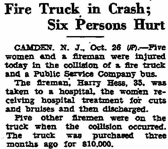 Harry Hess married Mary Osherchoski shortly after the 1924 City Directory was compiled. He was then still living at 1043 North 26th Street. After he married, he and his wife lived with her widowed mother at 2733 Sherman Avenue in Cramer Hill. A son, Allen F. Hess, was born in April 16, 1926. to Mary and Harry Hess. The family is listed at 2733 Sherman Avenue in the 1927 City Directory. After having worked as a laborer and more recently as a salesman, Harry Hess was appointed to the Camden Fire Department on April 4, 1928. He was still serving with the Camden Fire Department when the 1947 City Directory was compiled. The 1930 Census shows Harry Hess and family living next door to fellow Camden Fire Department member William Foehl, who lived with his family at 2731 Sherman Avenue into the mid-1930s. Another Camden firefighter, Charles A. Bates, later lived at 2731 Sherman Avenue. Son Allen F. Hess enlisted in the United States Army at Fort Dix, New Jersey on May 9, 1944. As he had had qualified for flight duty, he trained as a member of a bomber crew and attained the rank of Staff Sergeant. He was awarded the Air Medal, indicating that he flew at least five combat missions, most likely as a gunner. Allen F. Hess returned to Camden after completing his military service. His parents were still living at 2733 Sherman Avenue as late as 1947. He was appointed to the Camden Fire Department on November 14, 1950. Allen F. Hess was promoted to captain in May of 1960, and to Battalion Chief on June 11, 1966. After serving the City of Camden for 40 years, Chief Allen F. Hess retired on May 1, 1991. Harry H. Hess passed away on June 15, 1971. His widow joined him on December 15, 1998. |