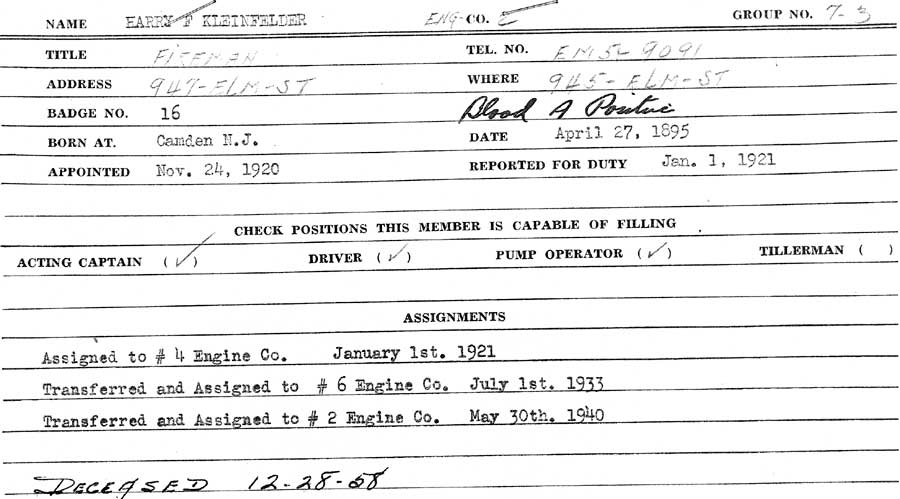 Harry Kleinfelder was married and the father of an infant when he registered for the draft on June 5, 1917. He was then living at his parents home, 406 Taylor Avenue. By the end of 1918 he and his wife had separated. He was still residing at the Taylor Avenue address, his wife Clara however was then living at 207 Washington Street. Harry Kleinfelder and his parents were still living at 406 Taylor Avenue in January of 1920. Both men were working as repairmen at the railroad yard. Sadly, Julia Kleinfelder passed away in March of 1920. On November 24, 1920 Harry Kleinfelder was appointed to the Camden Fire Department. He reported for duty on January 1, 1921 with Engine Company 4, at 320 Vine Street. John Kleinfelder was still living at 406 Taylor Avenue when he died in June of 1922. Harry and Clara Kleinfelder reunited in the late 1920s, boarding 947 Elm Street in North Camden, the home of brother firefighter Frank Oberman. Harry and Clara Kleinfelder appear to have parted ways when the Census was taken in April of 1930. Harry Kleinfelder was still boarding at 947 Elm Street. On July 1, 1933 Harry Kleinfelder was transferred to Engine Company 6 at Front and Linden Streets, where he served until May 30, 1940. Harry Kleinfelder was once again transferred, this time assigned to Engine Company 2, North 5th Street and Arch Street. On April 3rd, 1942 units of the Camden Fire Department's First Battalion were responding to an alarm at point and Erie Streets, North Camden. A group of children were on their way to a birthday party for nine-year-old, Betty Mogck. The group of excited birthday celebrants, hearing the fire engines coming, ran into the street to see where they were going. As Engine Company 2 was making the turn at Erie Street, the Chauffeur, Fireman Harry Kleinfelder pulled hard on the wheel to avoid running over the children but not before striking little Betty Mogck. The apparatus swerved to the side of the street, sheared off a utility pole and came to rest on the pavement. Two members were hurled to the ground, slightly injured. Betty's older brother, John, was down the block talking with friends and came running up the street. Betty Mogck was rushed to Cooper Hospital suffering from a broken leg. Firemen William Hopkins and Harry Haines were treated for bruises and released. Years later, Betty's brother, John J. Mogck, Jr. would himself enter the Department and rise from the ranks of Probationary Fireman to retire as Chief of Department. Harry Kleinfelder was still living at 947 Elm Street and working for the Camden Fire Department when he passed away on December 28, 1958. Long separated from her husband, Clara V. Kleinfelder died in 1968, last a resident of Sewell, New Jersey. |