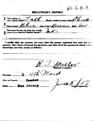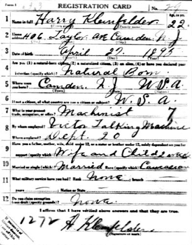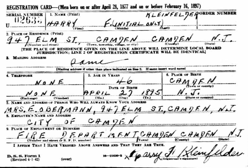 HARRY F. KLEINFELDER was born in Camden on April 27, 1895 to John and Julia Kleinfelder, one of seven children, only three surviving by the summer of 1900. His father had, in 1895, operated a bar at 640 Pine Street. When the Census was taken in 1900, the Kleinfelder family, which included older sisters Julia and Helen, lived at 1270 Mechanic Street. By 1906 the Kleinfelders had moved to 406 Taylor Avenue. John Kleinfelder was by then working as a car inspector, most likely for the at the nearby Pennsylvania Railroad yards at the foot of Federal Street.
