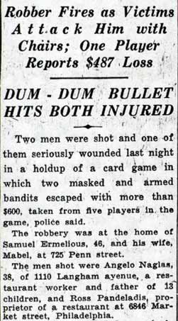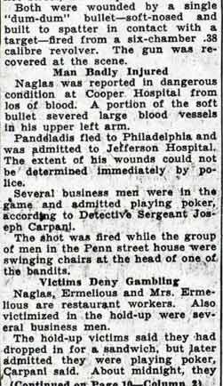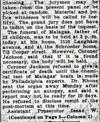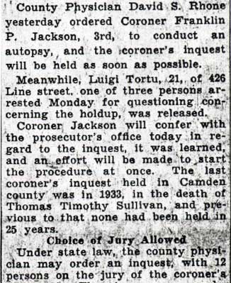INQUEST SET TODAY IN GAMBLING DEATH Jury List Prepared for Coroner's Action in Holdup Fatality The coroner's inquest to decide the cause of death to Angelos Magalas, Greek chef, who was shot during a card game holdup at 725 Penn Street on January 11, will be held today at 10 a. m. Coroner Franklin P. Jackson III, of Collingswood, will conduct the inquest and will select his jury of 12 from a list of 15 persons prepared by the office of County Prosecutor Samuel P. Orlando. Detectives already have subpoenaed 20 witnesses for questioning at the inquest, including players who were the victims in the holdup and three Camden physicians who attended Magalas prior to his death. The witnesses will include Samuel and Mabel Ermilios, tenants of the Penn Street house where the holdup occurred; George and Annette Mastros, who room at the house; Samuel Bosco, broadway barber; George Summers, Ross Pantel, Michael D' Andrea. and William Caras, who according to police were participants in the card game. All of the men were held as material witnesses in the shooting when arraigned today before Police Judge Gene R. Mariano. Doctors to Testify Other witnesses will include Dr. Paul Mecray, Dr. A. S. Ross and Dr. Edwin R. Ristine and Miss Sophia MacAfee, a Cooper Hospital nurse. Police who will testify in elude Detectives Thomas Murphy, Harry Kyler and William Boettcher and Patrolmen Richard Powers, Frank Clements, George Nicktern and Sergeant Jack Deith. The jury will be selected from Guy Clokey, Collingswood; Lawrence Ball, Haddonfield; Howard Friant, Collingswood; Harry Chew, Collingswood; Sig Schoenagle, Camden merchant; Raymond Hanly, real estate broker; Benjamin Brest, Raymond Worrel, John Eby, all of Camden; William H. Lorigan, Merchantville; David B. Robinson, Collingswood; Rev. James Pemberton and John McGowan, of Camden, Earl Jackson, of Collingswood and Morris B. Clark, of Haddonfield. Coroner Jackson refused to give a certificate of death until the chemical test of Magalas' brain was made by Philadelphia experts. The re suit will not be revealed until the inquest. Assistant Prosecutor Isaac Eason and County Physician David S. Rhone gave it as their opinion that Malagas died of natural causes rather than, the bullet wound. Coroner Jackson then ordered an inquest to be held. Police are searching for Frank Luggi, 21, of 322 Penn Street, who they say was one of the holdup bandits and the one who fired the bullet that struck Magalas. The last coroner's inquest held in Camden county was in 1933, in the death of Thomas Timothy Sullivan, and previous to that none had been held here in 25 years. Sullivan was 57 years old and lived at 401 State Street. He was employed as a detective by the Pennsylvania Railroad. He was found shot to death in a shack in the rail road yards on August 28, 1933. At that time, County Physician Edward B. Rogers issued a certificate of death that Sullivan had committed suicide. The decision of the county physician enraged members of Sullivan's family and they demanded an inquest. The inquest was ordered by then Coroner Arthur H. Holl, who presided. All the evidence in the case was presented to the jury of 12 men, and after deliberating for less than an hour, they returned a verdict that Sullivan had been murdered by persons unknown. Under state law, the county physician may order an inquest; with 12 persons on the jury of the coroner's choosing. The jurymen may be taken from the present panel of the petit jury or be picked at ran dom. The Grand Jury does not have to indict on the basis of the inquest. At the inquest Coroner Jackson will be assisted by attaches of the prosecutor's office. Malagas, the father of three children, lived at 1110 Langham Avenue. He was shot when several armed bandits held up a card game and he died several days later. |