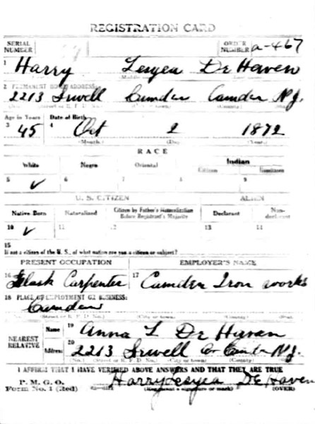 HARRY LESYEA DE HAVEN was born in Montgomery County PA on October 2, 1872. When the Census was enumerated in 1880, he was living in Upper Providence Township, Montgomery County PA, with his grandparents, Samuel and Elizabeth De Haven, Samuel De Haven was a carpenter, and Harry L. De Haven followed him into that line of work. Harry L. De Haven married his wife Anna around 1898. The couple were living in Camden NJ in 1900, at 2316 Federal Street in East Camden . He then was working as a shoemaker. By 1906 Harry and Anna De Haven owned a home not far from there, at 2213 Sewell Street in Camden NJ. This would be Harry De Haven's home until his death on August 9, 1933. Harry L. De Haven worked as a carpenter for the Pennsylvania Railroad at the company's Pavonia repair shop in the 1900s and 1910s. He was plying the carpenter's trade at the foundry in 1918 when he registered for the draft on September 12th of that year. He was still there, when the census was taken in January of 1920. In 1924 he was appointed janitor of the James A. Garfield Elementary School at North 29th and Cramer Streets in East Camden, a position he held until his passing. Harry L De Haven was survived by his wife, Anna. The couple had no children. |