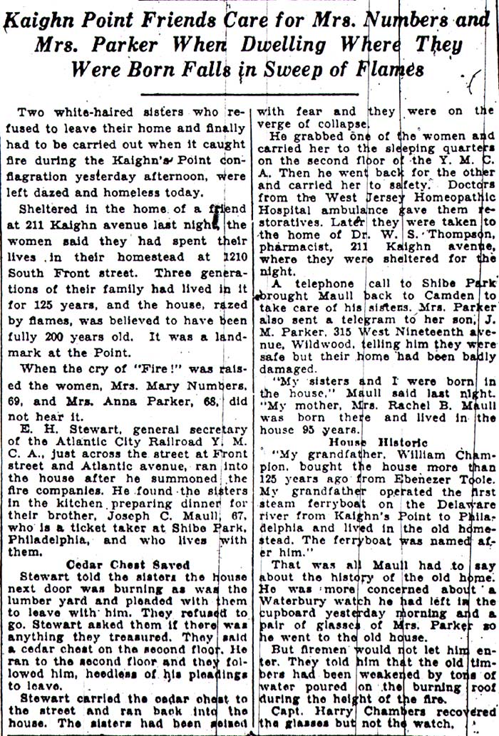 married Clara Elizabeth Price, the daughter of Camden Fire Department member Samuel Montgomery Price. A son, Harry H.B. Chambers was born on June 1, 1898. Sadly, the baby died on January 25, 1899. Two daughters followed, Clara Mae in 1899 and Henrietta in 1906. The Chambers' lived with Clara's parents at 906 Chestnut Street when the Census was taken in 1900. By 1906 through at least 1920 Harry and Clara Chambers rented a home at 908 Chestnut Street. Harry Chambers worked as a trolley conductor in the 1900s through at least 1914. By 1918 he had joined the Camden Fire Department. Daughters Clara May and Harriet Chambers married in 1920 and 1924, respectively; Clara May to John B.E. Waldron, and Harriet to Frank E. Flowers. The 1924 Camden City Directory shows that Harry and Clara E. Chambers had moved to 1452 Mt. Ephraim Avenue. By 1927 Harry Chambers had been promoted to Captain. He served as a junior Captain at Hook and Ladder Company 2 though at least 1929. He was still serving with the Camden Fire Department when the C.B. Coles & Sons Company lumber yard was destroyed by fire on July 10, 1933. Harry Chamber completed 20 years of service as a Camden fire fighter during the 1930. The Chambers family was still residing at 1452 Mt. Ephraim Avenue when Captain Chambers died on July 4, 1940. He was survived by his wife and daughters. By 1947 Clara Chambers was living at 113 North 25th Street in East Camden. She passed away in July of 1973 in Kearny, New Jersey. Older brother William Pringle Chambers also served on the Camden Fire Department. |