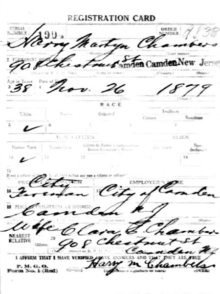 HARRY MARTYN CHAMBERS was born in New Jersey on November 26, 1879 to John James Chambers and the former Martha Wood. The family lived at 305 Wilson Street when he was an infant. By 1887 they had moved to 420 Evans Street in South Camden, and in 1890 were in a newly-built home at 1123 Baring Street. They moved to 1119 Baring Street in 1891, 1109 Baring Street, in 1892, and 1103 Baring Street in 1893, where they remained for three years. The 1896 Camden City Directory shows that the Chambers family had moved to 573 Division Street. They were listed at 785 Mount Vernon Street in the 1897 and 1898 editions. Harry Chambers was the oldest of at least four children, the others being William P, Elizabeth M., and Lucy Helms Chambers. On March 30, 1898 Harry Martyn Chambers |
