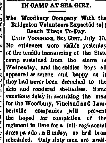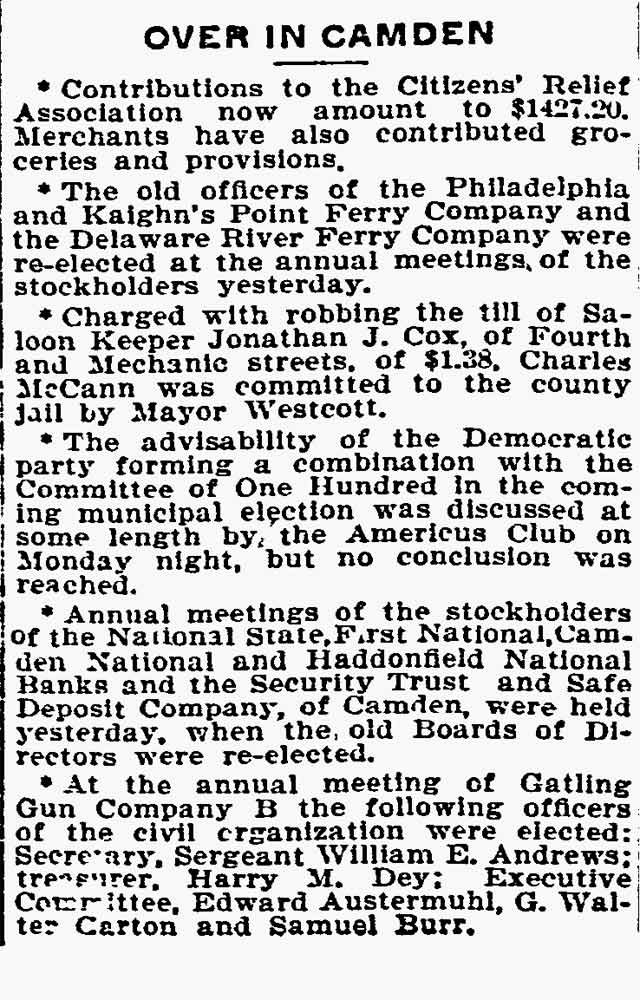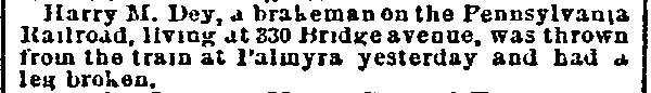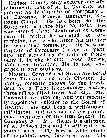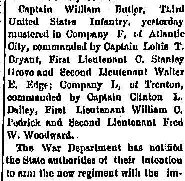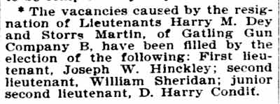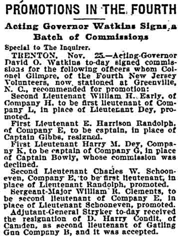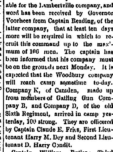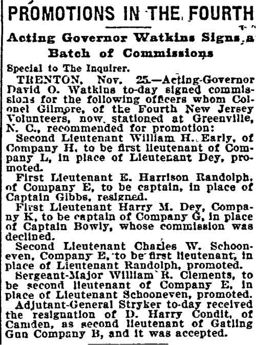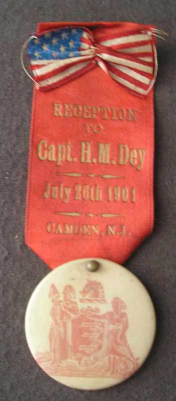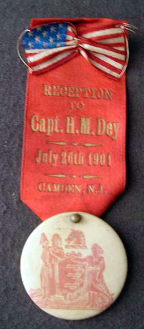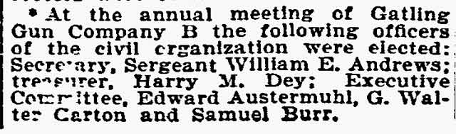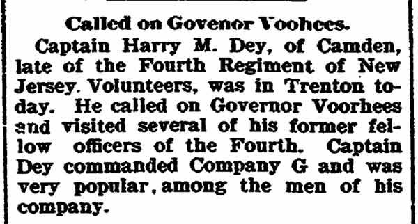 CAPTAIN HARRY MORTIMER DEY served with National Guard units in Camden in the 1880s and 1890s, primarily with Gatling Gun Company B. Harry M. Dey was born in Pennsylvaniua in December of 1863 to B. Franklin and Elmira Dey. He was one of at least four children, the others being B. Franklin Dey Jr., Minnie, and Ada Dey. When the census was taken in 1880 Harry M. Dey was living with his parents on Filbert Street on Philadelphia and working as a messenger. There were members of the Dey family living at 330 Bridge Avenue as early as 1882. By 1886 Harry M. Dye he had moved to Camden, and had joined Gatling Gun Company B of the New Jersey National Guard. By that year he had been elected sergeant. |