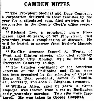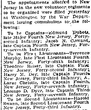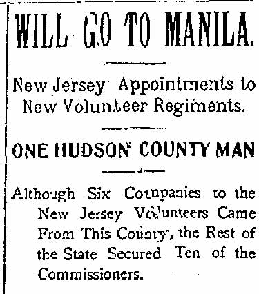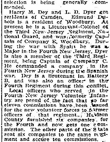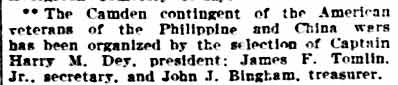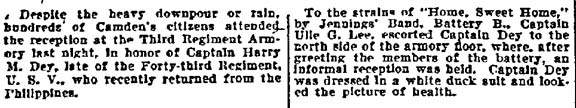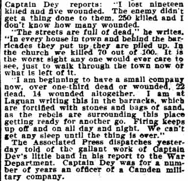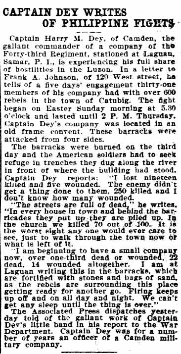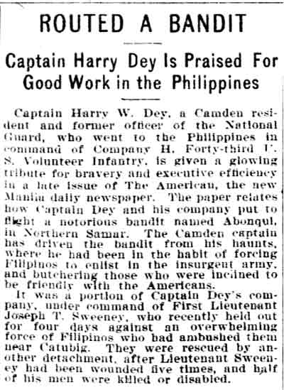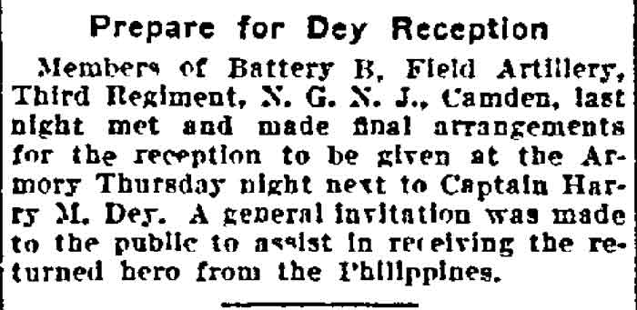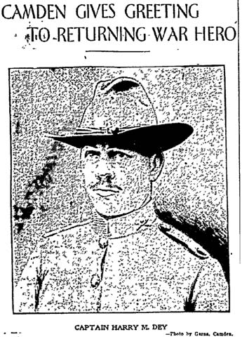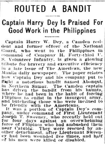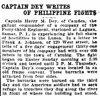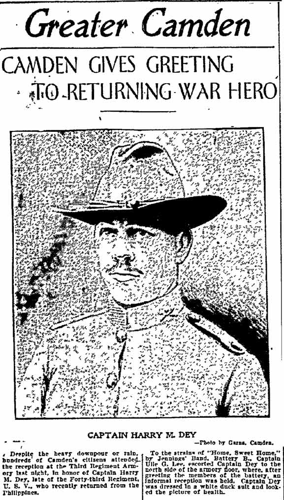 Harry Dey made his home in the late 1880s and early 1890s at 330 Bridge Avenue, and worked for a time as a brakeman with the Pennsylvania Railroad. By 1892 he had gone to work as a laborer at the Campbell Soup Company. By 1894 he had been promoted to clerk. The city directory for that year shows that he had moved to 120 West Street. By the following year he had moved to 119 North 10th Street. The 1898 Directory gives his address as 495 Newton Avenue. When the Spanish-American War broke out Harry M. Dey was commissioned as a Fir st Lieutenant with the 4th Regiment, N. J. Infantry on June 30, 1898. He was promoted to Captain on November 30, 1898. Honorably mustered out April 6, 1899, he subsequently volunteered for further service and was commissioned as First Lieutenant with the 43rd Regiment, U. S. Infantry, on August 17, 1899 and promoted to Captain, effective September 18, 1899. Captain Dey and his unit were sent to the Philippines, where he served with great distinction against bandits and insurgents , in the rebuilding of towns and villages and administration and institution of civic government in the islands. When the census was taken on June 30, 1900 Captain Dey was commanding the garrison at Barugo on the island of Leyte in the Philippines. His family was then living at 452 Berkley Street in Camden. An employee of the Campbell Soup Company prior to going overseas with the Army, Harry M. Dey returned to Camden in July of 1901, and went back to work at Campbell Soup. He married for the second time around 1904, and by the summer of 1910 his wife Mary R. Mulford had bore three children, Clara, Harry M. Jr., and Joseph M. Dey. The Deys were living at 519 South 6th Street. They were still at that address in 1914. By January of 1920 the family had moved to 608 South 5th Street. By this time there were three more daughters, Elizabeth, Mary, and Alice Dey. Another daughter, Jean Dey, was born shortly after the Census was enumerated. The family left Camden not long afterwards, and were in the Woodbury area by 1924. Harry M. Day and family were living at 18 Hessian Avenue in West Deptford Township by April of 1930. |