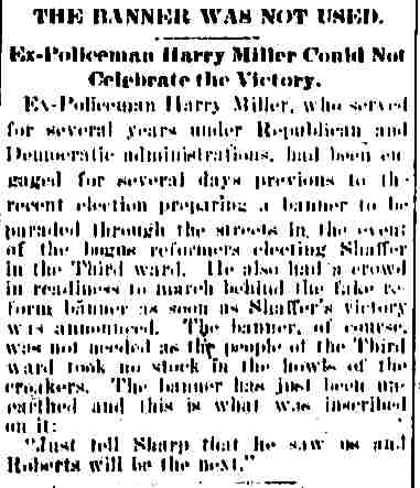 Miller Frank T. Lloyd - Charles V.D. Joline Frederick A. Rex - William F. Rex Robert F. Miller - Albert Keaser George V. Murry - John Morrisey Harry Selby - William H. Selby Dr. George D. Grimes - William Laws John Cherry - John S. Smith Charles Cahill - Edward Hartman Owen McDonald - John Helm Albert Keaser - F. Morse Archer John Wagner - John C. Truitt Anna Hutner - William Ridgway Ogden |