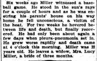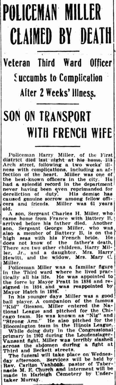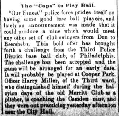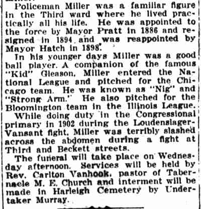 Harry Miller played professional baseball in Wilkes Barre, Scranton, and Harrisburg, Pennsylvania in the early 1880s, and also for a team called the Cubs in the Philadelphia League. I have not found records or any other reference regarding him playing in the Illinois League, he is not the Harry Miller who played for Ottumwa in 1890. He did not play for the Cubs in the National League. |