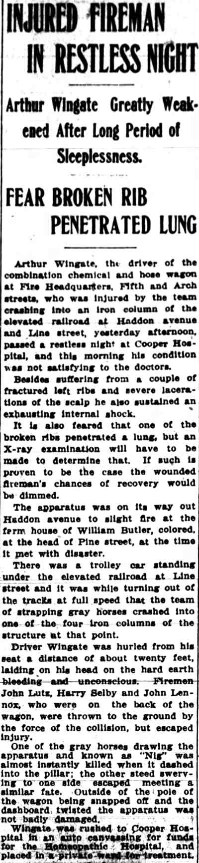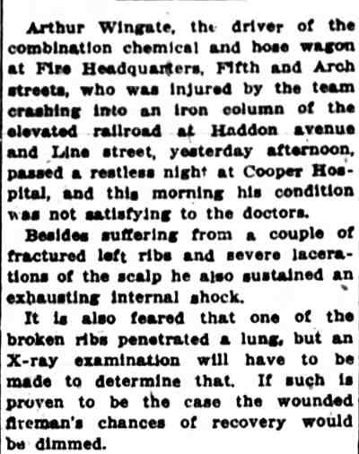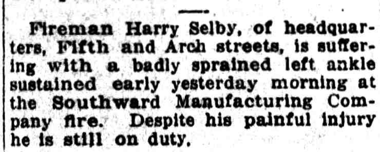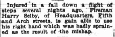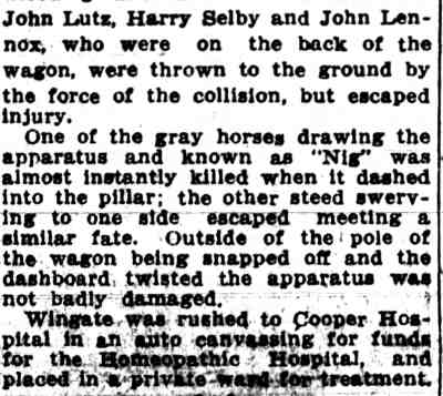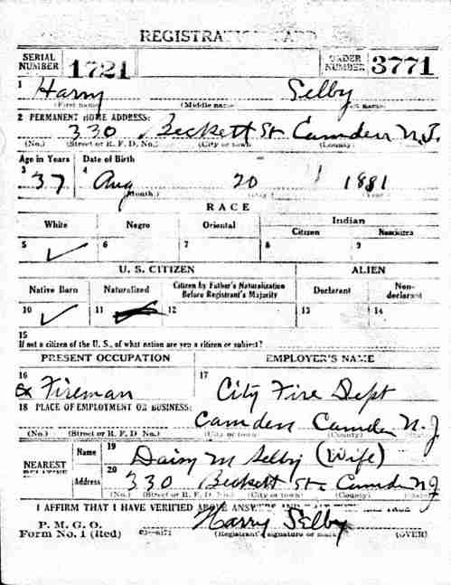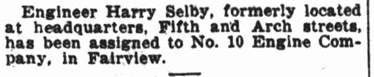 HARRY SELBY was burn on August 20, 1881 to William Henry Selby and his wife the former Emma Dunn Gibbon. He was the fourth of nine children born to the Selbys, coming after brothers William H. (1875-1876), George L. (1879-1950), and sister Elizabeth M. (1877-1882). He was followed by Mabel (1884-1948), Mary E. (1997-1953), Walter W.(1891-1974), John G. (1895-1969) and Dorothy (19800-1974). His father was active in Republican politics and served with the Camden Police Department for 14 years, and later with the Water Department. Both Harry and older brother George were somewhat active politically and involved in the early 1900s with Company C, Third Regiment, New Jersey National Guard. George L. Selby was still active with the Guard when the United States went to war in 1917 and served heroically at the Battle of the Argonne Forest, and served the public for many years after his retune at war's end. Harry Selby was appointed to the Camden Fire Department on January 1, 1908. He initially served at the firehouse in the 600 block of Kaighn Avenue. Assigned to Engine Company 2, he was was injured when the combination hose and chemical wagon he was in was involved in an accident on May 19, 1910 at Haddon Avenue and Line Street. Colliding into an iron pole that supported the elevated railway, one of the horse pulling the apparatus was killed on impact, driver Arthur Wingate was seriously injured and Harry Selby, John Lennox, and John Lutts were thrown to the ground. Harry Selby was able to return to service but the injury, most likely to his back, plagued him for the rest of his days. Harry Selby later served as driver for Deputy Chief Samuel S. Buzine. After Buzine's retirement he was appointed stoker, and in 1920 was promoted to Lieutenant and was transferred to Engine Company 10. Suffering from chronic pain as a result of the injury suffered in 1910, Harry Selby took his own life on May 4, 1923. Harry Selby married Daisy Mae Harris on March 7, 1908. The Selby's lived at 330 Beckett Street, adjacent to his father's residence at 328 Beckett Street until 1920. By 1921 they had moved to 326 Beckett Street, and younger brother Walter and his family occupied 330 Beckett Street. The marriage produced three children, William H. Selby, Thelma May Selby, and Norman H. "Norm" Selby. Norm Selby was a star athlete at Woodrow Wilson High School in the 1930s. Extremely fast, he was an All-South Jersey end and a hall of fame baseball player who also excelled in track and basketball. The Second World War ended his bid to play with the New York Giants but he excelled in top semi-pro ball for two decades, and was enshrined in the South Jersey Sports Hall of Fame in 2009. |