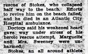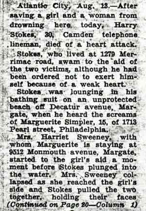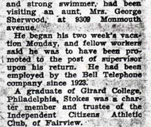HARRY STOKES was born around 1905 to Garrett and Amelia Stokes. He was a graduate of Girard College in Philadelphia, and began working for the Bell Telephone Company in New Jersey in 1923. He moved to the Fairview section of Camden NJ, residing at 1279 Merrimac Road. Harry Stokes was a charter member and trustee of the Independent Citizens Athletic Club of Fairview. Harry Stokes died at Atlantic City NJ on August 12, 1936 when he suffered a fatal heart attack after rescuing two women who were in danger of drowning. He managed to bring them to safety, but the exertion put a fatal strain on his heart. He died in an ambulance on the way to the local hospital.