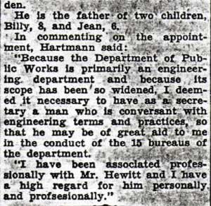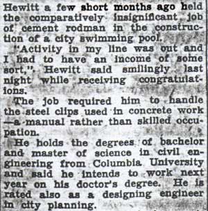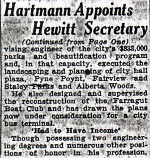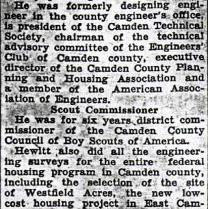 HARRY W. HEWITT was born in Pennsylvania around 1904. Married to Anna May, he was living in Camden at the time of the 1930 Census, with their son Harry W. Jr., who was born in 1928. He had graduated from Columbia University with Bachelors and Masters of Science degrees in civil engineering. By 1936 he had moved to 1069 Princess Avenue in the Parkside section of Camden. Employed by the City of Camden in the mid-1930s, Harry Hewitt executed the landscaping and planning of several beautification projects in the city that remain evident today, including Staley Park in Centerville, Alberta Woods Park in East Camden, Pyne Point Park in North Camden, and Fairview Park. He also was involved at Roosevelt Plaza, the beautiful city park that was located in front of City Hall, on the site of the present Parkade Building. Harry Hewitt also did all the engineering surveys for the Federal government's housing program in the 1930s. In that capacity he was involved in the site selection for the Westfield Acres and Clement T. Branch Village housing projects. Harry Hewitt also designed and supervised the reconstruction of the Farragut Boat Club in Cramer Hill. In October of 1936 he was appointed to serve as confidential secretary to City Commissioner Frank J. Hartmann Jr., whose was responsible for supervising the 15 bureaus that comprised Camden's Department of Public Works. |