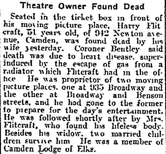 HARVEY FLITCRAFT born in 1862 to George and Joanna Flitcraft in Pilesgrove Township, Salem County NJ. George Flitcraft was a farm worker, and by the time of the 1880 census Harvey and older brother Wilmer were both working on the farm as well. The two brothers left the farm, and by 1887 Wilmer Flitcraft had established his grocery business at at 501 South 3rd Street, the corner of South 3rd Street and Berkeley Street. Harvey Flitcraft was working for his brother. The 1888-1889 and 1890-1891 Directories show that Harvey Flitcraft had established his own grocery store at the southwest corner of west street and Clinton Street, and that he lived there as well. Harvey Flitcraft was one of the pioneer movie theater owners in Camden NJ. From 1905 until his death in 1913. Harvey Flitcraft operated at various times three different theaters in Camden at different locations on Broadway, known as the Casino, the Royal, and Fairyland. He owned a home in the latter part of his life at 558 Washington Street, but was residing at 942 Newton Avenue at the time of his death. Harvey Flitcraft was survived by his wife Elizabeth, a daughter, and a son, Emmor W.H. Flitcraft, of Haddonfield NJ, and his brother Wilmer, who had moved back to Pilesgrove by 1920. He was buried at Evergreen Cemetery in Camden. Elizabeth Flitcraft passed away in 1935. |