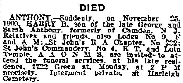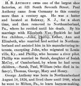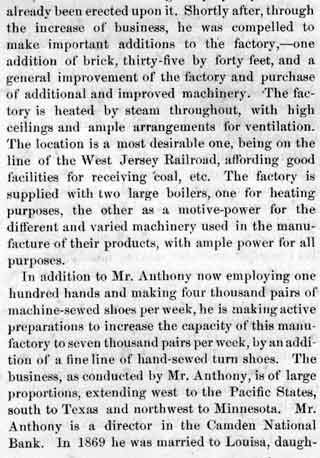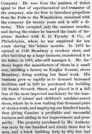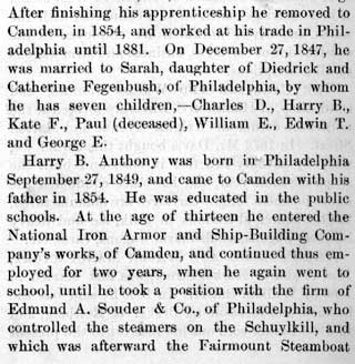 HARRY B. ANTHONY was born in Philadelphia in 1849, and came to Camden at the age of 5 with his family. At the age of 23 he opened up a crockery business, Anthony's China Hall. In 1876 he made his father manager of the business, and went into the shoe manufacturing business. By the mid 1880s he had a factory turning out 4,000 pairs of shoes a week, and shipping to all points in the nation. Last a resident of Philadelphia, H.B. Anthony passed away on November 25, 1909.