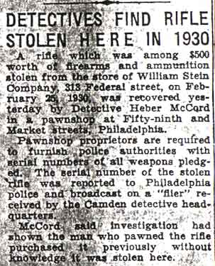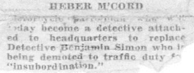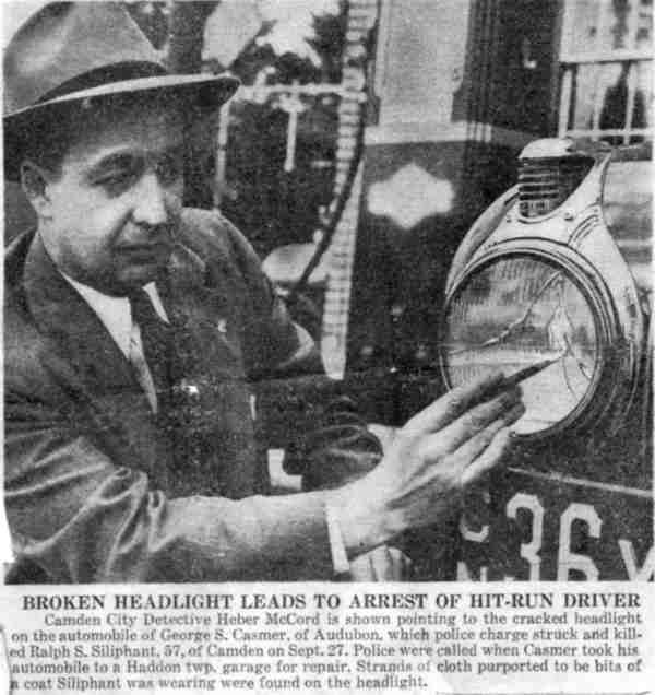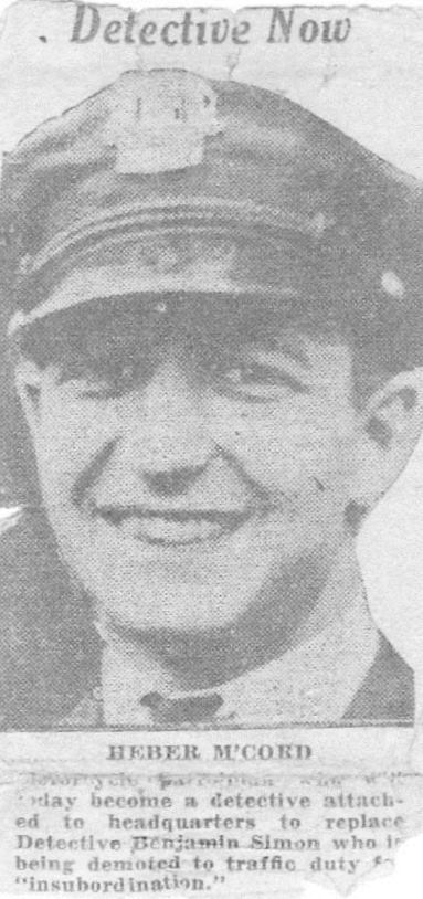 HEBER E. McCORD was born June 23, 1902 in Elverson PA to Sidney P. McCord and his wife Eleanor D. Pike McCord. He was named after his paternal grandfather. Sidney P. McCord was for many years Camden's chief financial officer. After a brief stint as a minor-league baseball player, Heber McCord joined the Camden Police Department on April 22, 1924. Heber McCord married in the 1920s, and lived with his wife Olive in East Camden. The 1936 New Jersey Bell Telephone Directory shows him living at 328 Boyd Street. In 1932 Heber McCord was promoted to detective, and was still in that post in 1947. He was then living at 432 South 6th Street with his father and brothers Merritt and William. Heber McCord moved to 804 W Kings Highway in Mount Ephraim in the mid-1950. By 1959 the McCord family included two sons, Robert and Michael E. McCord. After a 35 year career with the Camden Police Department, Heber McCord and family moved to Pinellas County, Florida in 1959. Heber E. McCord eventually moved to St. Petersburg FL, where he passed away on October 25, 1974. |