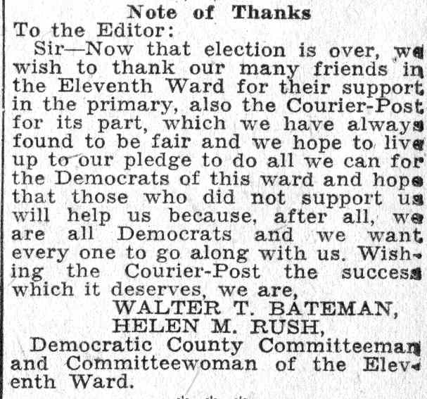 World War I Selective Service records and the 1920 Census show her living at 2550 East Dauphin Street in Philadelphia with her husband, George Washington Rush, and sons George and William. The family moved to the Cramer Hill section of Camden at some point thereafter. Helen Rush became active in Democrat politics and at one point served as the county committeewoman from the Eleventh Ward, which comprised all of Cramer Hill. When the 1930 Census was enumerated the Rush family was living at 3339 Farragut Avenue in the Cramer Hill section of Camden, New Jersey. Although no longer on the county committee by the fall of 1931, Helen Rush remained active in Democrat politics into the mid-1930s. At some point she clashed with the powerful Emma Hyland, as evidenced by a letter to the editor of the Camden Courier-Post from February of 1936. The family then lived at 3219 Pierce Avenue. The City Directory for 1940 does not list George and Helen Rush. Selective Service records show that they had moved back to Philadelphian by the spring of 1942. The family then resided at 1111 East Susquehanna Avenue. George Rush was working at the Kensington Shipyards at Beach and Palmer Streets. Helen Rush remained a resident of Philadelphia until her passing in 1955. |