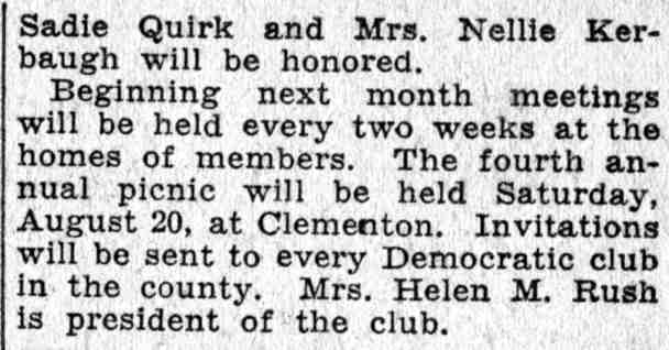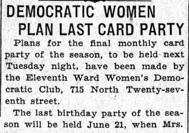 DEMOCRATIC WOMEN TO HOLD ANNUAL PARTY The annual masquerade party given by the Eleventh Ward Women's Democratic Club will be held tonight at 715 North Twenty-seventh street. The affair is being arranged by Mrs. Helen M. Rush, president, and Mrs. Verna Carnes, chairman of the entertainment committee. The judges committee includes Mary O'Drain, Mrs. Mary O'Neil and Mrs. Florence Oberle. A card party will be given by the club on Tuesday, Nov. 12. Proceeds will be used to finance the annual Christmas party for the children in the ward and to supply baskets for needy. Mrs. Helen Purkins heads the committee in charge, assisted by Mrs. Bertha Bowers, Mrs. Rose Bowers, Mrs. Clara Kimber, Mrs. Mary Yates, Mrs. Ruby Hensman, Mrs. Catherine Riggins, Mrs. Margaret Richards and Mrs. Alberta Roberts and Mrs. Rush. |