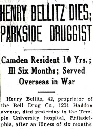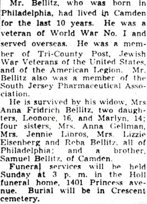 As of 2003, the Bell Pharmacy has been operating at 1201 Haddon Avenue in Camden, the southwest corner of haddon avenue and Kaighn Avenue, since the 1930s. The business was owned and operated in its early days by Henry Bellitz. Henry Bellitz was born in the Kamenets Podolsky guberniya (province) of Russia on June 24, 1892 to Solomon and Mollie Bellitz. The family came to the United States in 1901, and eventually settled in Philadelphia PA. Besides Henry there were at least six other children, Samuel, Beckie, Annie, Lizzie, and Jennie. Henry Bellitz was already working as a pharmacist when he registered for the draft in Philadelphia PA on June 15, 1917, employed by C.P. Gabell at 5202 Lancaster Avenue. According to his draft card, Henry Bellitz was then married, and lived with his wife Marjorie at 1239 South 5th Street in Philadelphia. Brother Samuel Bellitz had by this time married and moved to Camden NJ. He lived at 775 Kaighn Avenue, and had already founded his business, the Novelty Hair Goods Company. 775 Kaighn Avenue later became the property of the Naden family, who operated their business, the Naden Store there for several decades. It appears that Marjorie Bellitz passed prior to the 1920 Census, most likely during the flu epidemic of 1918. Henry Bellitz became a United States citizen that year. Henry Bellitz served with the United States Army during World War I. He was living with his parents and sister Beckie when the census was taken in 1920, at 1938 Franklin Street, in Philadelphia. He married Anna Friedrich around 1923. By 1930 Henry Bellitz owned a pharmacy at 601 South 11th Street in Philadelphia. He came to Camden NJ around 1932, and became the proprietor of the Bell Pharmacy at the corner of haddon and Kaighn Avenues. Active in civic affairs, he was a member of the Tri-County Post, Jewish War Veterans of the United States and the American Legion. He also was a member of the South Jersey Pharmaceutical Association. Henry Bellitz took ill in the fall of 1941. He passed away at Temple University Hospital in Philadelphia PA on April 9, 1942. After services at the Holl Funeral Home at 1401 Princess Avenue in Camden, Henry Bellitz was laid to rest at Crescent Burial Park in Pennsauken NJ on April 12, 1942. He was survived by his wife, daughters Lenore and Marlyn, 5 sisters, and a brother, Samuel Bellitz, who operated the Novelty Hair Goods Company, first at 775 Kaighn Avenue, and later at 1408 broadway and finally at 1138 Broadway. This business remained in Camden until its closing on December 4, 2003. The Bell Pharmacy, under different management, remains in business to this day. |