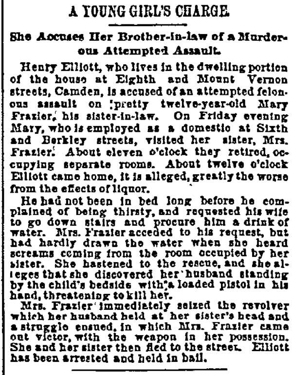 Henry R. Elliott, Jr., 72, veteran of the Spanish- American War, died Saturday at the Soldiers' Home, Vineland, after two years illness. Mr. Elliott served in Company L, Third Regiment, New Jersey National Guard, under Capt. Winfield S. Price, now major general commanding the 44th Division. He had been at home five years. Mr. Elliott is survived by one son Henry R., Jr., two grandchildren, one great grandchild, and three sisters, Mrs. Albert L. Dudley and Mrs. William Delamater, Camden, and Mrs. Charles H. Sullivan, Haddonfield. Mr. Elliott was a member of General John A. Mather Post, No. 39, United Spanish War Veterans, which will conduct, military rites at 2 p.m., Wednesday, at 1401 Princess avenue. Burial will be in Harleigh Cemetery. |