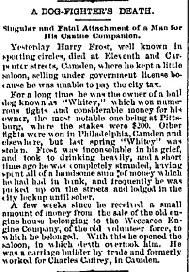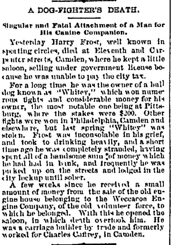 the enemy back. A second attack of Confederate On July 13th the Tenth New Jersey was in another skirmish outside of Washington DC. On July 15th, at Tennallytown, Maryland, while the regiment was en route to Snicker's Ford, Virginia Corporal Henry Frost deserted. Henry Frost returned to Camden and became involved with the Weccacoe Fire Company No. 2 as a volunteer fireman in the late 1860s. Henry Frost was appointed to the Camden Fire Department as a replacement for J. Kelly Brown, who had resigned from service as an extra man with Engine Company 2, on October 9, 1872. Henry Frost was a blacksmith by trade. He was living at 112 Taylor Avenue during his time in service with the Camden Fire Department. Henry Frost was dismissed from his position on July 15, 1873 along with Bernard Dennis and Thomas Grapevine. This ended his involvement with the Camden Fire Department. The 1878 Camden City Directory shows Henry Frost, blacksmith, at 412 South 2nd Street. Not long afterwards Henry Frost went to work for Charles Caffrey, who had a large carriage building business near Tenth and Market Streets. The 1880 Census shows Henry Frost as a carriage painter at 412 South 2nd Street, where he lived with his wife Sarah. The 1881-1882 lists "Harry Frost, blacksmith" at 578 Carman Street, however the 1882-1883 and 1883-1884 City Directories show Henry Frost at 578 Carman Street. In 1882-1883 he is listed as a "coach smith", in the 1883-1884 directory his occupation is laborer. Henry Frost's real avocation and to some extent occupation was as a dog fighter. His bulldog, "Whitey", won numerous fights and a good deal of money for Henry Frost, both in Camden and in other large cities in the northeast. In the spring of 1883 the dog was stolen, and Henry Frost began drinking to excess. As a former member of the Weccacoe Fire Company No. 2, Henry Frost realized a bit of money when their old firehouse at 503 Benson Street was sold in 1883. With the money he received he opened a small saloon at North 11th and Carpenter Streets, where he died on December 28, 1883. Henry Frost was survived by his wife Sarah, who operated the business for about a year, appearing in the 1884-1885 City Directory as "Frost Sarah, liquors, 11th and Carpenter". The 1885-1888 City Directory reads"Frost Sarah, widow of Henry", at 410 Mickle Street. Henry Frost's brother, George Frost, later served as a member of the Camden Fire Department, as did brother-in-law William Turner. Another brother, Charles A. Frost, was a successful businessman in Camden. Henry Frost's nephew, George W. Frost, the son of his older brother Frederick, had a long career with the Camden Police Department, retiring as Chief of Police in the late 1940s. Another nephew, brother George's son Frank Frost, served with the Camden Police Department in the 1910s. |