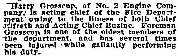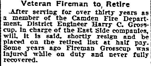 HENRY C. "HARRY" GROSSCUP was born on February 18, 1849 in Pennsylvania, one of at least three children born to Fanny and William Grosscup. The family came to New Jersey not long after his birth. The 1870 Census shows the Grosscup family living in Camden's Middle Ward. Henry Grosscup was by then working as a machinist. Two doors away lived the family of William C. Lee, a Civil War veteran who worked as a pork dealer and also as an extra man with the Camden Fire Department. Both Henry Grosscup and William C. Lee may have been volunteer fire fighters in Camden in the years prior to December 7, 1869 when the Camden Fire Department went into service. Harry Grosscup was appointed to the Camden Fire Department on October 26, 1871 to replace William T.G. Young Sr. as stoker with Engine Company 2. He resigned on October 8, 1872 after Chief Robert S. Bender took a leave of absence. He returned to the Fire Department on April 8, 1873 when Chief Bender returned. His abilities were soon recognized, although the Fire Department, like much else in Camden at the time, was highly politicized. The