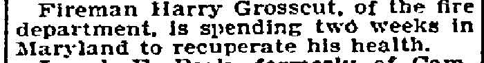 Engine Company 2's apparatus at that time consisted of an Amoskeag second class steamer (makers plate #319), a hose wagon and a supply wagon. In late 1889 or early 1890 Harry Grosscup moved to 334 Mickle Street. By late 1891 he was boarding at 207 South 4th Street. The 1892-1893 Directory show him living at 336 Mickle Street, while the 1893-1894 Directory has him back at 207 South 4th Street. The 1894-1895 Directory again lists him at 336 Mickle Street. From 1897 through 1899 Directories show him at 331 Mickle Street. The 1894 Camden City Directory lists Engine Company 2's personnel as consisting of the following: Foreman Harry C. Grosscup; Engineer, William Morris; Driver, john p. long; albert jones, George Wade, william hertline, David Andrews. Another reorganization occurred after the annexation of Stockton in 1899. Harry Grosscup was promoted to the position of District Engineer, with duties similar to that of a Deputy Chief, and was placed in charge of the new fire companies in East Camden based at North 27th Street and Federal Street. In June of 1907 Harry Grosscup apparently decided it was time to retire, after having served the City of Camden for over 30 years. The 1910 Census shows Harry Grosscup had left the Fire Department and was living with his brother Fred at 584 Federal Street. Harry Grosscup passed away on January 7, 1916 at Anglesea, New Jersey. Funeral services were held at the home of his brother Fred Grosscup, 584 Federal Street in Camden. Harry Grosccup was buried at Evergreen cemetery in Camden. |