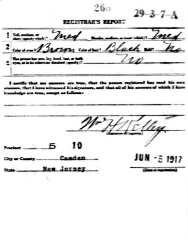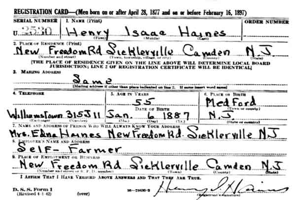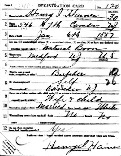 HENRY ISAAC HAINES was born in Medford NJ on January 6, 1887 to William H. Haines and his wife, the former Mary P Wright. Besides Henry, there was an older sister, Eleanor, and two brothers, R. Newborn and Charles Pancoast Haines. It appears that older brother Charles had come to Camden by 1906, and that he may have brought Henry with him. Charles P. Haines was working as a clerk and living at 324 Washington Street when the 1906 Camden City directory was compiled. Around November of 1909 Henry I. Haines married. The 1910 Census shows Henry I. and Martha Haines living at 914 North 8th Street in North Camden. Charles P. Haines also resided there. The brothers worked as salesmen in groceries. A boarder also resided there. Martha Haines bore a son, Charles H. Haines, around 1911. By 1914 Henry I. Haines had gone into business as a butcher at 546 North 7th Street. The 1920 census shows that Charles P. Haines was still living with his brother at the time. He was working as a manager of a wholesale grocery. The family lived and worked at 546 North 7th Street through 1929. The 1930 census shows that the family had moved to 921 North 7th Street. Young Charles H. Haines was working as a clerk at the RCA-Victor Plant. Older Brother Charles P. Haines was still working for a wholesale grocer. In the early 1930s Henry I. Haines was active politically with the Republican party in Camden. He was elected to the Republican County Committee from the Tenth Ward in 1932 and 1933. By 1942 Henry I. Haines had moved away from Camden. His draft card states that he had remarried and was living with his wife, Edna, on a farm he owned in on New Freedom Road in Williamstown NJ. |