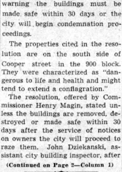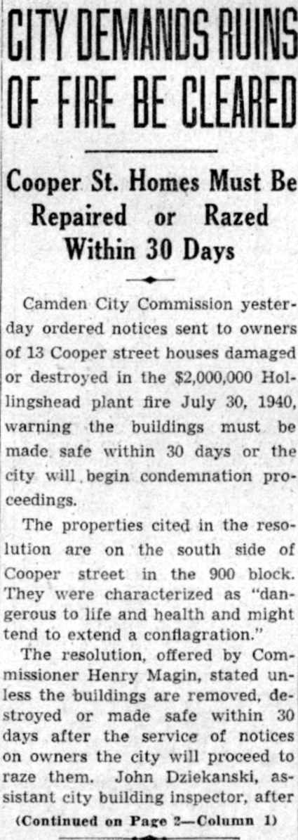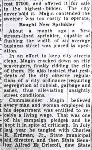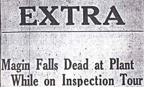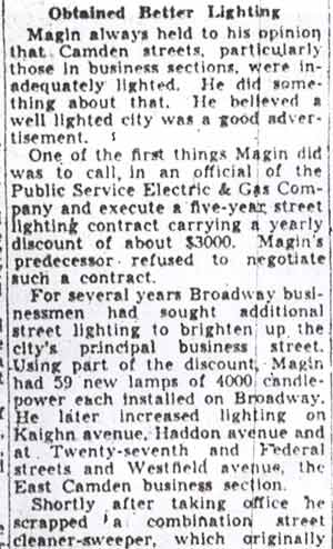City Commissioner Henry Magin fell dead at 11:20 AM today while making a tour of the city incinerator plant with other city officials. He stepped from a platform and called to James Carr, superintendent of streets, to "catch me". He slumped into Carr's arms. Carr and William F. Augustine, Courier-Post photographer, rushed him to Cooper Hospital, but physicians pronounced him dead. He had been ill of heart trouble for more than a year. |