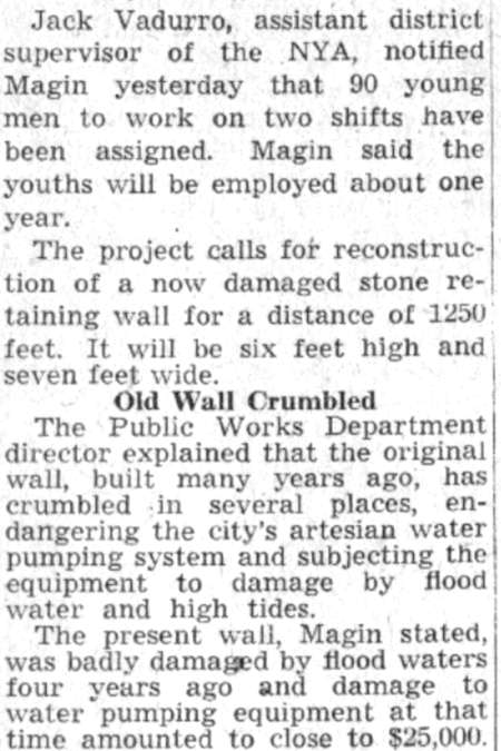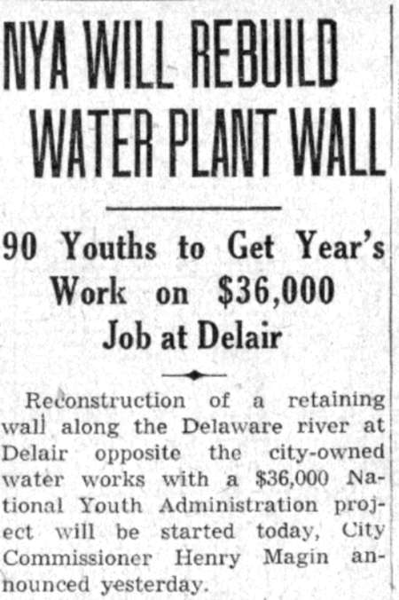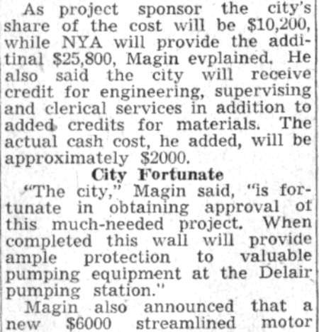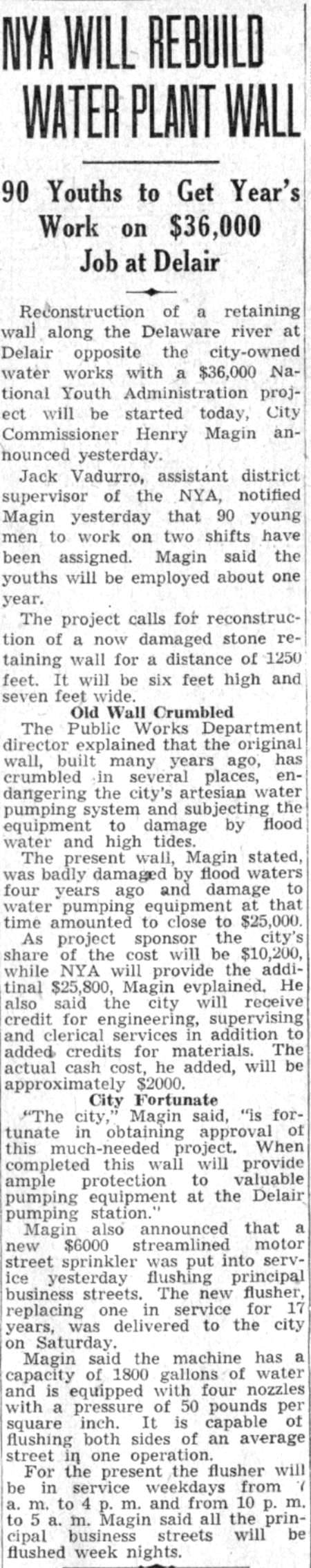 HOME BASEMENTS CLEARED OF WATER BY FIRE APPARATUS Except for minor isolated in: conveniences in a few sections, Camden city escaped storm damage yesterday. In a low area at Thirty-fourth street and Westfield Avenue the basements of four homes were pumped free of water by fire apparatus, and several manhole covers loosened and thrown off by sewer waters backing up, were retrieved and fastened down in the area bounded by Second and Front streets near Market street. More than 40 employees of the Camden water department aided by 75 WPA workers labored throughout last night to barricade the Delair Pumping Station of the Camden. Water Works against the rising water of the Delaware Rriver. Commissioner Henry Magin, director of public works, who directed the work, announced shortly after midnight the precautions were about completed. He declared the men had been working for hours filling bags with sand which were piled around the walls of the small brick structure housing the pumps. "We are not worried much now," Magin announced, "since the work has just been completed and we believed the waters of the Dela-ware River can be kept back from the pumps. I understand Woodbury is in bad shape for water and we are making plans now to tie-up with the Gloucester pumping stations so water can be pumped into Woodbury if it is needed. "This time we were prepared be-fore the floods happened. It will not like several years ago when thousands of dollars in damage were caused to the water system floods." Magin said he had been on the scene all day directing the precautionary work and that Camden city itself only experienced several minor sewer line breaks which were repaired quickly. He said a fire department pumper would available from 1 a. m. on today while the Delaware River approached its crest at 1 a. m. in case of at any eventuality. . |