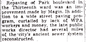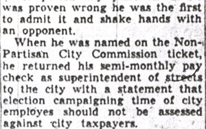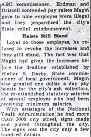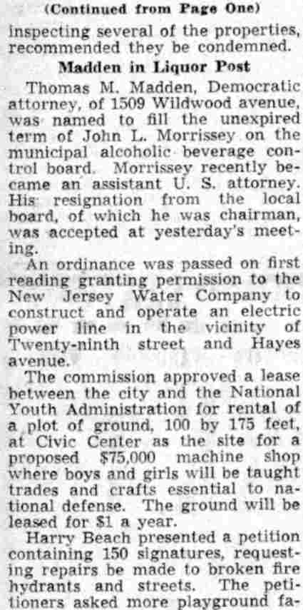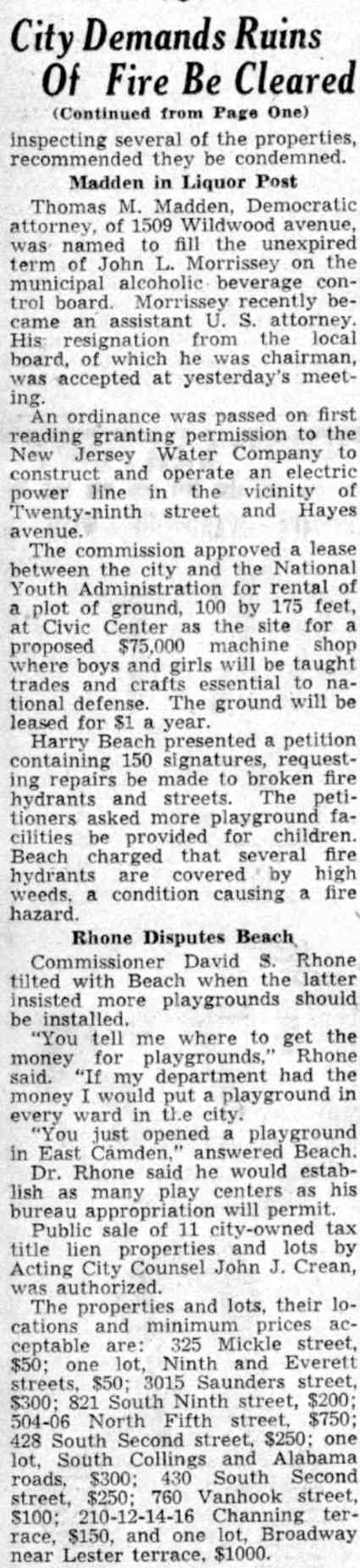 PROMOTES 3, FIRES 3, REHIRES 4 Three dismissals, three promotions and four reinstatements and two new hirings were announced yesterday by City Commissioner Henry Magin, director of public works. Dismissed were Eugeni Gatti, 208 Washington street; Julio Marcozzi, 321 Line Street, and George Pollard, 336 Stevens street, all temporary laborers at $4 a day. James Carr, 1409 Princess avenue, a laborer on asphalt repairs at $6 a day, is reclassified as general foreman of the department, effective today, at $2100 a year, subject to Civil Service promotional examination. John Dziekanski, 1414 Mt. Ephraim avenue, a laborer in the building bureau at $6 a day, is reclassified as architectural draftsman at $2100, also subject to examination. Oscar Moore, 543 Washington street, Ninth Ward freeholder, will receive $6 instead of $5 a day as a temporary laborer. Reinstated were Lawrence Abbott, 910South Third Street, a brother of Frank Abbott, deputy to Mayor Brunner, as a temporary laborer at $5 a day; Anthony Carrier, 416 Benson Street, a temporary laborer at $4 a day; James Jackson, 1117 Lawrence street, and Otis Still, 261 North Eleventh street. All were discharged by Frank J. Hartmann, Magin's predecessor. |