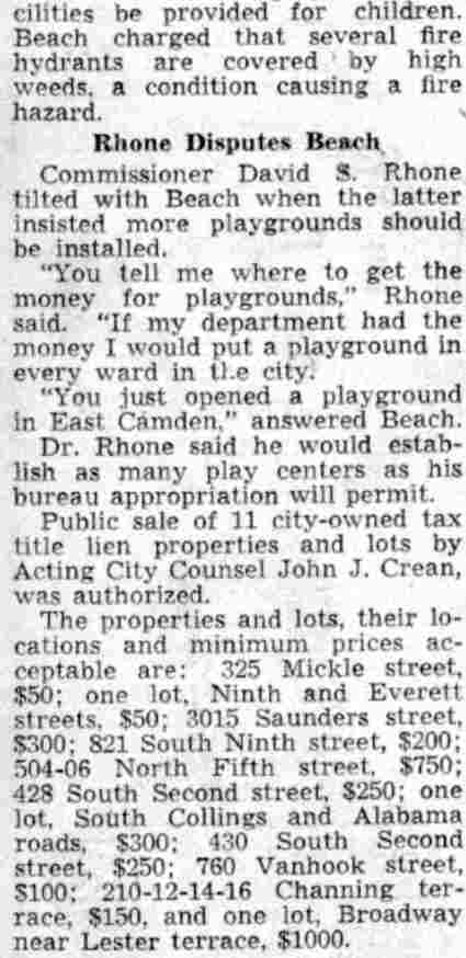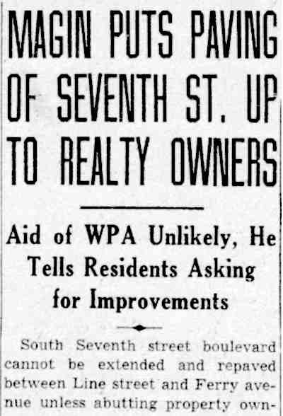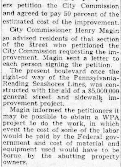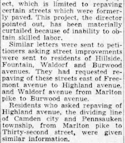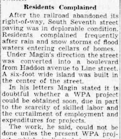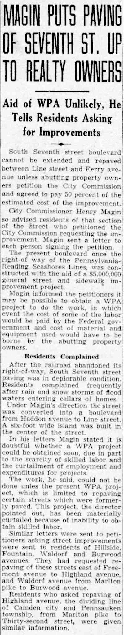 BROADWAY STORES SEEK 7TH ST. PARKING AREA The Camden City Commission will be urged to convert South Seventh Street from Benson Street to Kaighn Avenue into a parking area by a delegation representing the Broadway Business Men's Association next week. The group will confer with Commissioner Henry Magin Tuesday at 2:30 PM in his office and request that he make a study of the plan and present it to other city commissioners. The street has not been used as a thoroughfare since the former West Jersey & Seashore Railroad tore up the tracks on which it formerly operated its electric line. |