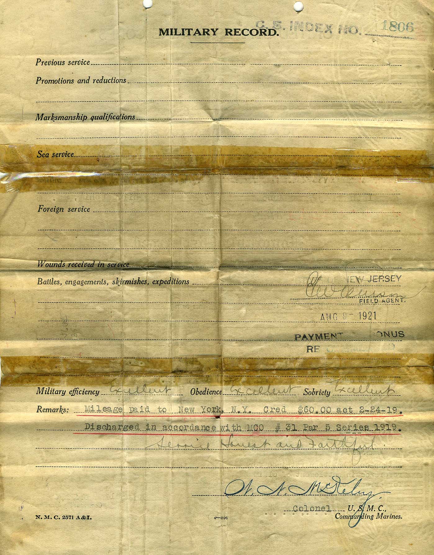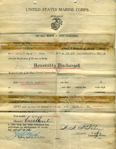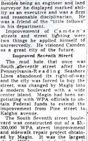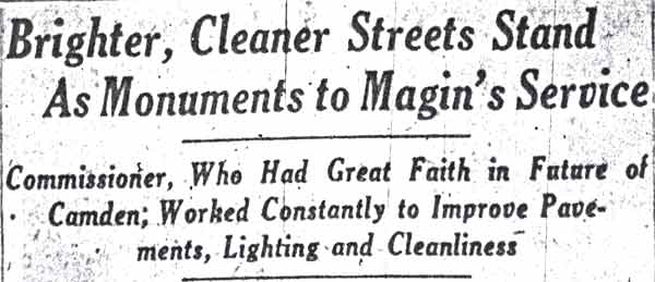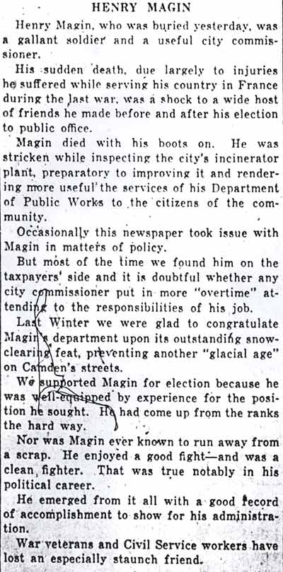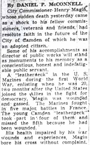 HENRY MAGIN was born in New Jersey around 1897. When America entered World War I, he enlisted in the United States Marine Corps on June 12, 1917, and qualified with the rifle as a sharpshooter. He served with the Marines in France, where he was wounded, apparently by German artillery. Private Magin was honorably discharged from the Marine Corps on July 14, 1919. He was bothered by pieces of shrapnel that could not be removed for the remainder of his life. Upon returning to America, he married his pre-war sweetheart, Helen Elias of Philadelphia, in 1919. The couple was living in Philadelphia in January of 1920, when the census was taken. They lived with her parents in Philadelphia. Henry Magin was then working in a glass factory. A daughter, named Helen for her mother, was born not long after the census enumeration. Henry Magin was not content to make the glass factory his life's work, so he attended to furthering his education. In 1925 he graduated from Drexel University with a degree in civil engineering. He moved his family to Camden during the 1920s, and received his New Jersey license to practice municipal engineering early in 1930. At the time of the 1930 Census, Henry Magin, had found work as a municipal engineer, most likely in Camden, where he resided. He was living with his wife Helen and their daughter, then age 9, at 3054 Alabama Road in the Fairview section of the city. Henry Magin was very active in veterans and fraternal organizations, and became well known in Camden during the 1930s. The Democrat party in Camden called on him to run for the post of City Commissioner in 1939, and he was elected to that position in the May election. He replaced Frank J. Hartmann Jr.. as the Director of Public Works. Henry Magin died quiet unexpectedly of a sudden heart attack on Friday, August 22, 1941, while inspecting conditions at the city incinerator on Federal Street. He had finished conferring with another public employee when he was stricken. James Carr, of the Highway Department, caught him as he fell. Henry Magin was very popular figure in Camden, the Camden Times, a weekly newspaper of that era reported that "… services were conducted in the city commission chambers of the City Hall" and that "Fully 8,000 persons viewed the remains…as the body lay in state in the City Hall." The 1947 Camden City Directory shows his wife Helen as still residing at the Alabama Road address. |