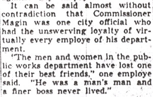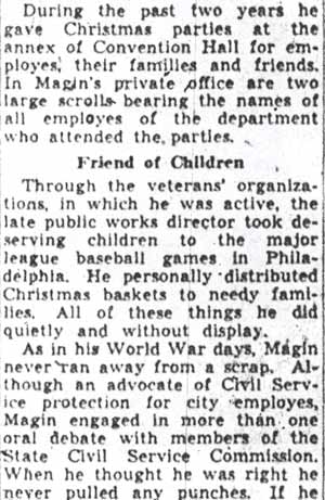 Funeral services for City Commissioner Henry Magin were held Tuesday, with many officials and colleagues in veteran's and fraternal circles participating. Commissioner Magin, who was 44, and head of the Public Works Department of Camden, died suddenly Friday, just as he had finished talking to an official. As he fell he was caught in the arms of James Carr, of the Highway Department. Services were conducted in the city commission chambers of the City Hall, and were in the charge of Rev. Dr. W. W. Ridgeway, pastor of St. Wilfred's Episcopal Church, Westfield Avenue and Dudley Streets, East Camden. Fully 8,000 persons viewed the remains Monday night as the body lay in state in the City Hall, and Mayor Brunner gave a half holiday to all city employees so they could attend the funeral service. Magin was a veteran of the World War and was injured during action on the other side. The casket was carried by war veteran associates of the public works director, who died from a heart attack Friday. A color guard from the Veterans of Foreign Wars and the American Legion preceded the casket, followed by the four remaining members of the city commission, Mayor George E. Brunner and Commissioners E. George Aaron, Mrs. Mary W. Kobus and David S. Rhone. A guard of honor lined both sides of City Hall steps, 22 policemen on one side and 22 firemen on the other, representing Magin's age, 44 years. Interment was made in the National Cemetery, at Beverly, N.J. Harry Leonard, 2750 Federal Street, had charge of the funeral.. |