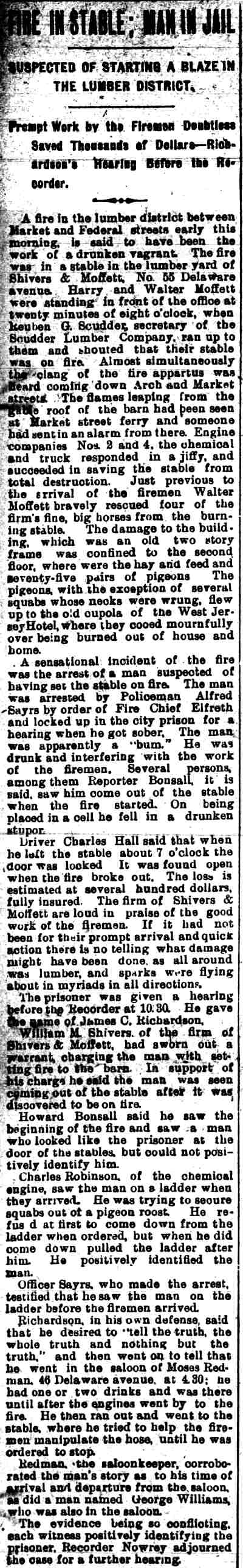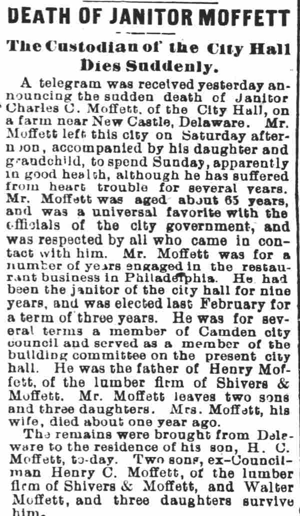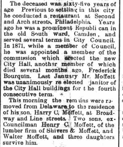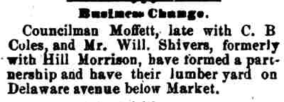 THE LUMBER-YARD of Shivers & Moffett is located on the west side of Delaware Avenue, below Market Street. It was first started in January, 1885, by the present firm, the individual members being William M. Shivers, who had been for a long time with Mr. Morrison, the lumber dealer, above Market Street, and Henry C. Moffett, late with C.B. Coles. The yard has a frontage of four hundred and fifty feet on Delaware Avenue and is one thousand five hundred feet in depth to the port warden’s line. The stock consists of all kinds of builders’ lumber. The trade extends to Pennsylvania, through Southern New Jersey and to points along the Delaware River.. |