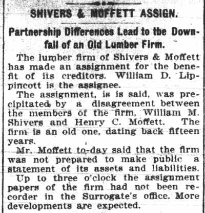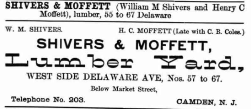 SHIVERS & MOFFETT, LUMBER, NO review of Camden's industries would do the city's commercial activity justice were it to fail to call attention to the importance of the lumber industry in our midst. Among the representative houses in this department is that of Shivers & Moffett which this well-known firm established in 1885. They occupy a neatly arranged office, adjoining which is an enormous yard of 120x300 feet in dimensions half stocked with general builders' lumber of the most approved stock excellence. The business done is a large one and is constantly developing in consequence of the energy and aim which is put into it by its enterprising owners, who employ seven assistants in the transaction of business. Mr. Shivers is a native of Camden County and Mr. Moffett of Philadelphia. The latter gentleman has been one of our city councilmen. Both are wide-awake and pushing merchants whose success is richly merited. |