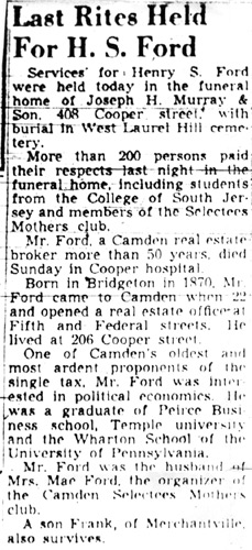 HENRY S. FORD was born in New Jersey in 1870 to Benjamin and Christina Ford. An only child, his early years were spent in Bridgeton NJ, where his father was a nail cutter. Henry S. Ford came to Camden at the age of 22 and opened a real estate office at 504 Federal Streets. He remained active in the real estate business for over 50 years. In January 1920, when the Census was taken, Benjamin Ford had passed away. Henry S. Ford had established a real estate business, and lived with his mother at 504 Federal Street. Henry S. Ford married late in life. At the time of the April 1930 census he was still engaged in the real estate business in Camden, where he owned a property at 802 Market Street with his wife Mae C. Ford. Mr. and Mrs. Ford had moved to 206 Cooper Street by October of 1936. Henry S. Ford passed away at Cooper Hospital on December 14, 1947. |