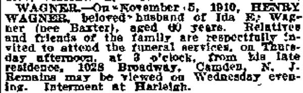 Henry Wagner was born in Camden, New Jersey in July of 1850 to Michael and Margaret Horneff Wagner. Michael Wagner was a carpet weaver, and when not working for the City of Camden as a fire fighter, Henry Wagner followed this trade. The Wagner family appears in Camden's South Ward in the 1860 census. The family then consisted of Michael and Margaret Wagner, and five children, Henry being the oldest, followed by Cassie, Jacob, William, and Charles Wagner. The 1870 Census shows the Wagner family in Camden's South Ward. Henry Wagner is living at home, as are seven younger siblings, William, Charles, John, Adam, Elizabeth, Maggie and Mary are all living at home. It is unclear at this time as to what became of Cassie Wagner, who may have married off, or Jacob Wagner, who would have been 16 years old and possibly living elsewhere as an apprentice. As stated above, on October 23, 1872 Henry Wagner was appointed to the Camden Fire Department as an extra man with Engine Company 1. He joined his uncle, George Horneff, who was an original member of the Company and the Fire Department. City Directories from the ate 1870s and early 1880s show that Henry Wagner was still living with his parents, but was in the process of establishing a carpet weaving business in the 1000 block of Broadway. The 1880 Census has Henry Wagner living with his parents at 349 Pine Street. Of Henry Wagner's younger siblings, William, Charles, John, Adam, and Mary are all living at home. It appears that Elizabeth and Maggie had not survived the decade. The 1882-1883 City Directory shows that Henry Wagner had permanently moved to 1028 Broadway. His family was still living at 349 Pine Street. Sadly, Michael Wagner passed away in 1884. Brother William Wagner took over his father's business, and in the 1880s opened up a shop at 719 South 4th Street. Henry Wagner married Ida Baxter in 1884. His wife Ida had given birth to three children by the time the 1900 Census was taken, Charles H. Wagner, Harry J. Wagner, and Eva Wagner. The family was then living at 1028 Broadway. The family was still at that address when the 1910 census was enumerated. Henry Wagner died on November 5, 1910. He was buried at Harleigh cemetery. By the time of the compilation of the 1914 Camden City Directory, his widow and children had all moved to 506 North 4th Street in North Camden. Ida Baxter Wagner passed away in 1952 at the age of 89. Henry Wagner is not related to Harry Jacobs Wagner Jr., who was a member of the Camden Fire Department from the late 1920s through April 1964 and at one time served as Acting Chief of the Department. Henry Wagner does not appear to be related to Joseph Wagner, who served as an extra man with Engine Company 1 from July 8, 1878 to September 8, 1878. |