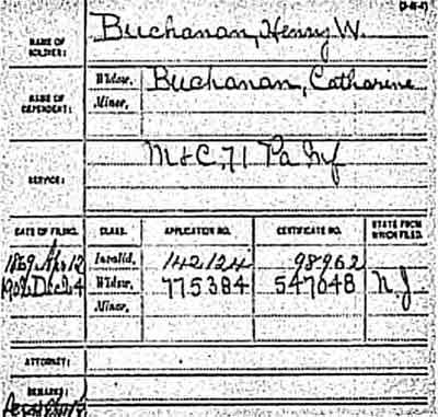 1841. Henry C. Buchanan later remarried. When the census was taken in 1860 Henry Washington Buchanan had taken up the printer's trade. He was single then but would soon wed as the Civil War began. He married Sarah Wooldridge who sadly passed in 1862. Henry Washington Buchanan enlisted in the Union Army as a Private on August 23, 1861, as a member of Company C, 71st Infantry Regiment Pennsylvania (also known as the 71st Pennsylvania Volunteer Infantry or simply the 71st Pennsylvania Volunteers). He was slightly wounded at the Battle of Antietam in 1862, but made a full recovery. Henry Buchanan was promoted to Full Corporal on or around November 15, 1862, and to Full Sergeant on March 1, 1863. After three years service, he mustered out of Company C, 71st Infantry Regiment Pennsylvania on July 2, 1864 in Philadelphia PA, one of only 153 of the original 2200 men who enlisted in 1861 to serve the entire three years. During Sergeant Buchanan's time in service he also fought at the Battle of Gettysburg. His unit, Company C, 71st Pennsylvania Volunteers was the company just to the right of the 69th Pennsylvania at the Angle at Gettysburg. This is the site of Confederate General Armistead's breakthrough. It is known that Sergeant Buchanan was at Gettysburg, but there is not documentation that he was at the Angle, although it is probable. Later he was wounded during the battles at The Wilderness. Below is the full regimental History of the 71st Pennsylvania Volunteers